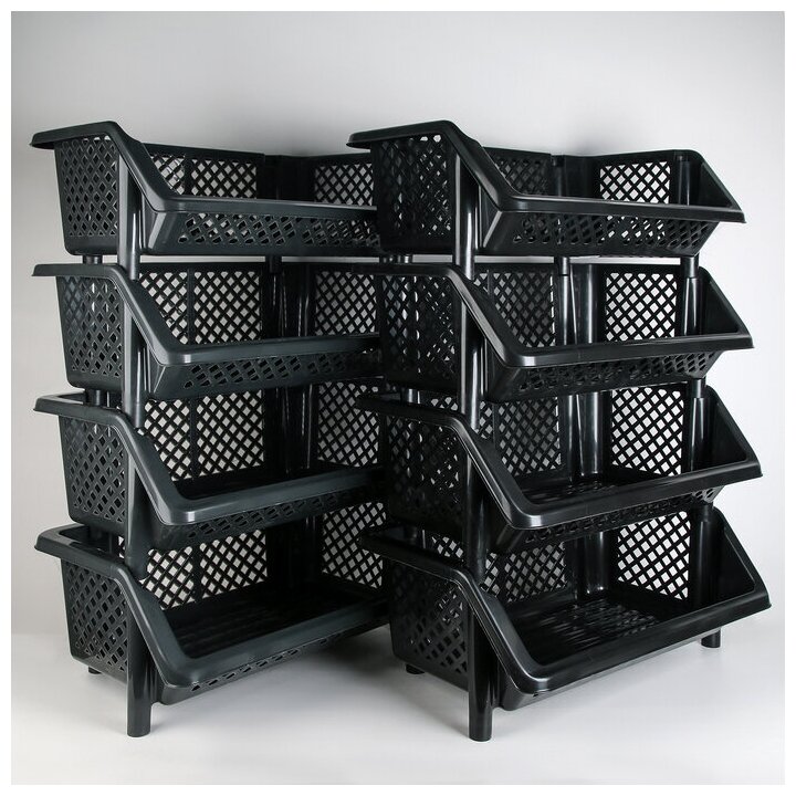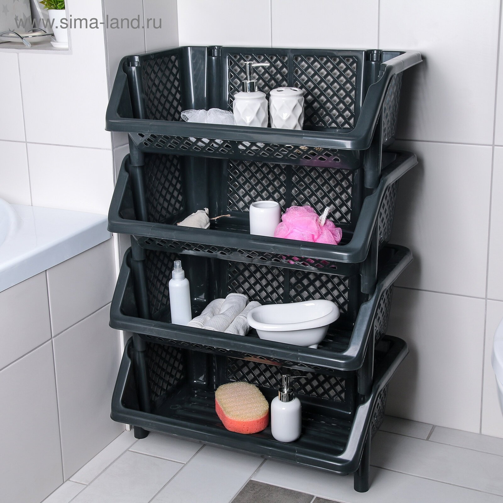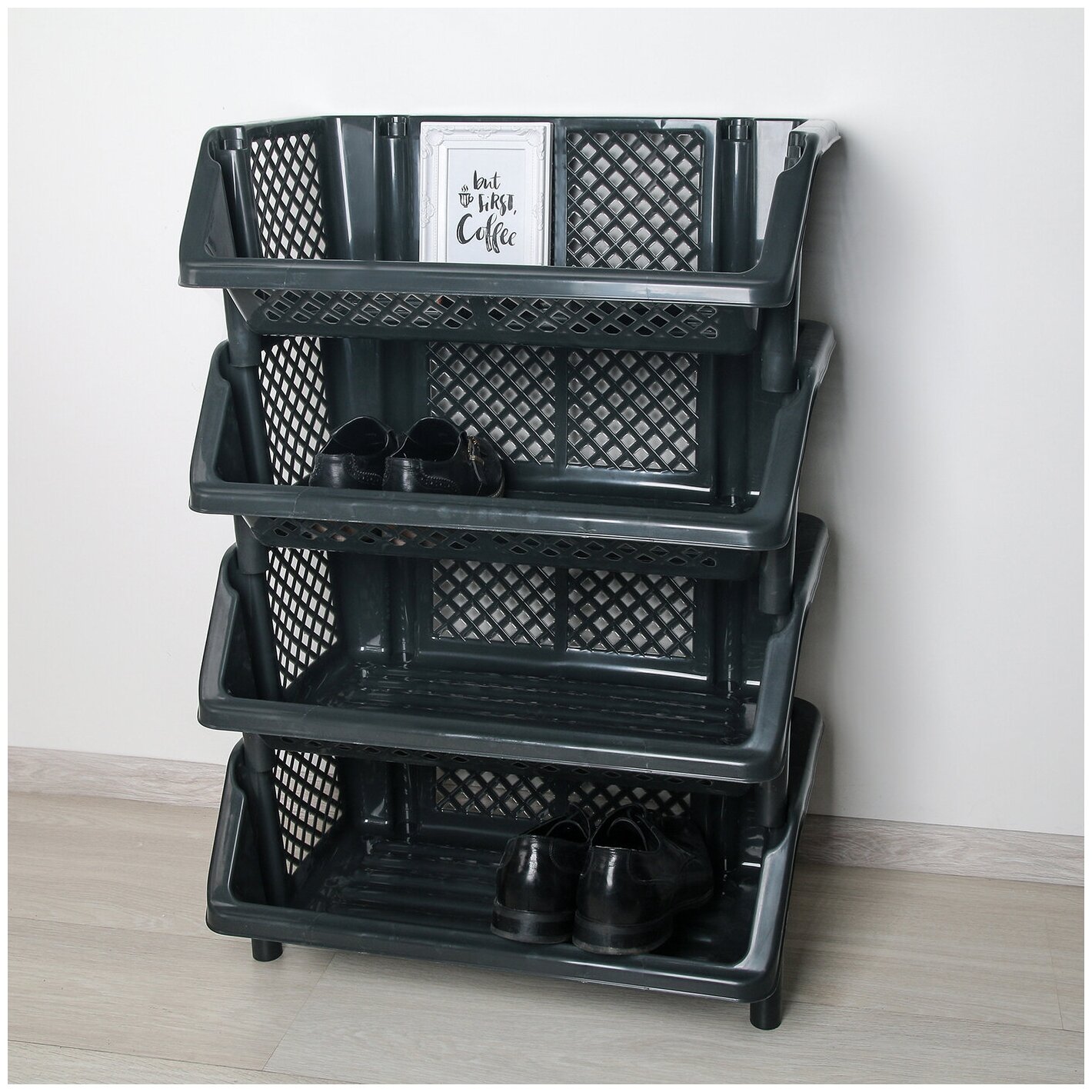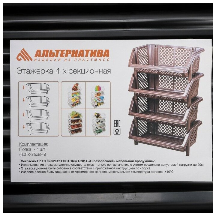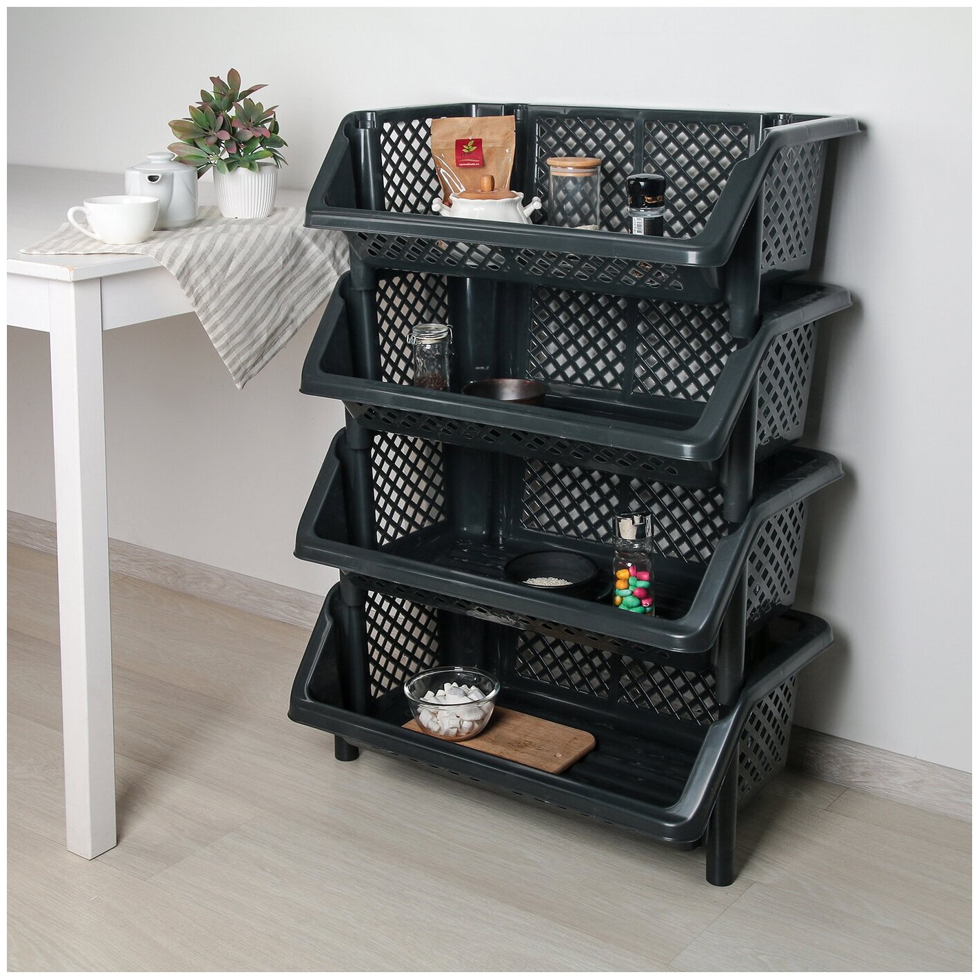 Этажерка предназначена для хранения различных предметов в доме. Данное изделие поможет сэкономить пространство и хранить все полезные вещи под рукой. Благодаря прочному материалу, можно класть множество вещей, не боясь, что данное изделие сломается или треснет. Каждая ячейка выдерживает до 80 кг, в собранном виде четыре секции выдерживают до 120 кг. При необходимости транспортировки или хранения, несколько ящиков можно компактно сложить друг в друга, и они займут минимум места. Изделие удобное, вместительное и в то же время компактное.