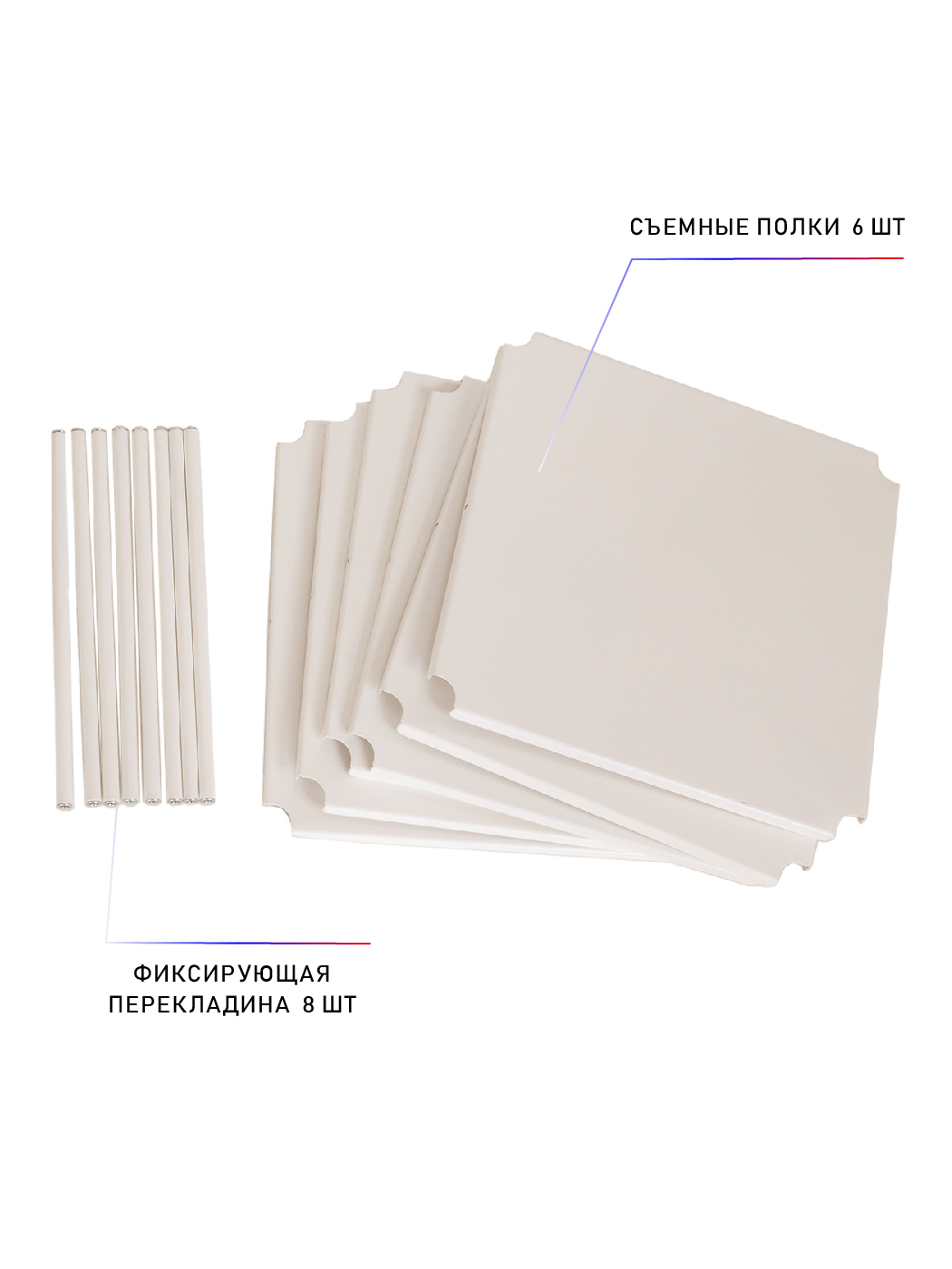 Комплектация: элемент стойки верхний задний – 1 шт., элемент стойки верхний передний – 1 шт., элемент стойки средний – 2 шт., элемент стойки нижний – 2 шт., перекладина фиксирующая – 8 шт., полка (или полка с перфорацией) – 6 шт., крепеж – 16 шт.