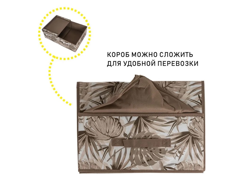 Компактный, в сложенном виде, коробка для хранения занимает мало места, его удобно брать в дорогу. Достаточно вытащить плотное дно и сложить органайзер. Контейнер для хранения представляет собой твердый каркас, покрытый материалом спанбонд, идеально подходящим для хранения вещей. Кофр имеет крышку, защищающую содержимое от пыли.