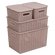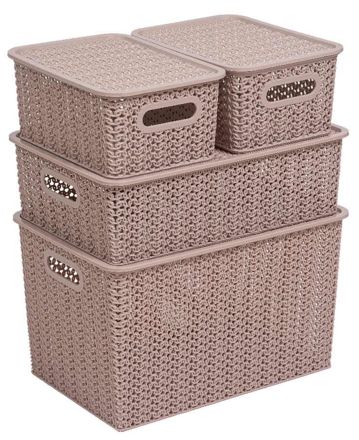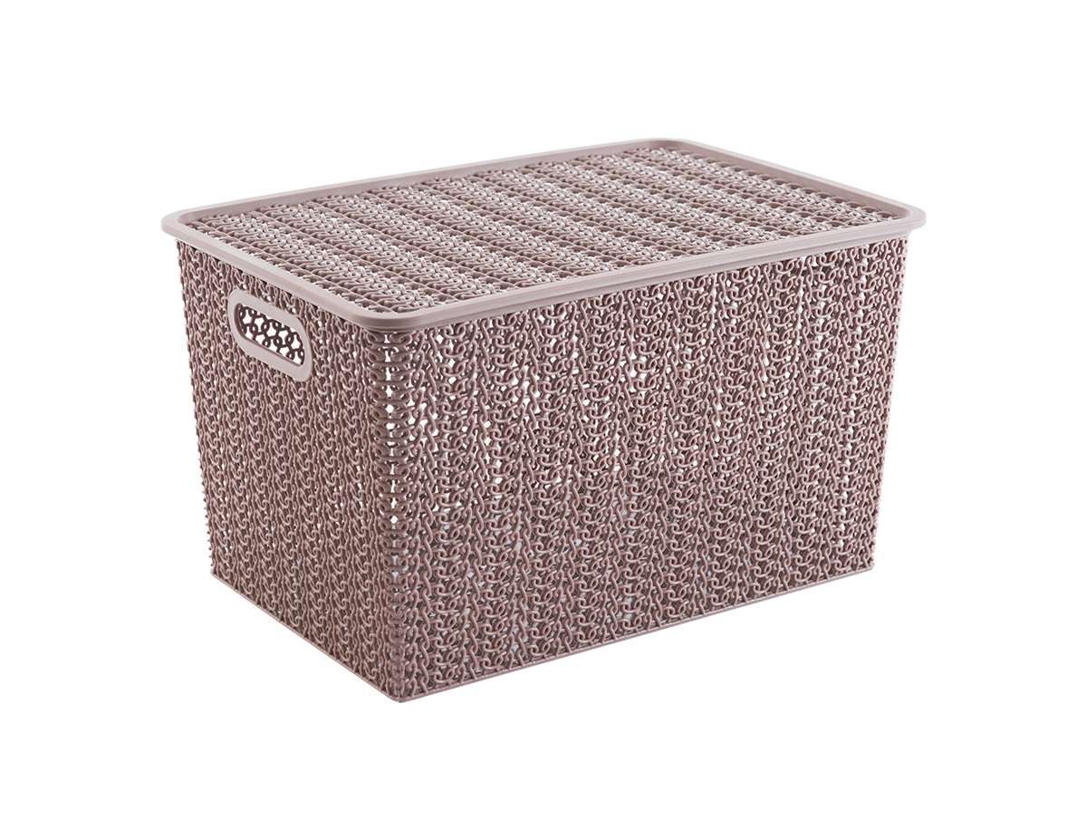 Емкость из пищевого пластика для хранения и переноски аксессуаров и продуктов питания. В объеме 14л корзинки оптимальны для хранения одежды, обуви, овощей, книг и игрушек и пр. С врезными ручками обтекаемой формы корзинки удобно перемещать. Бортик по периметру крышек обеспечивает фиксацию при штабелировании корзинок друг на друга. Узор «Вязь» по всему корпусу и крышке придает корзинкам натуральный вид и делает их легкими и проветриваемыми.