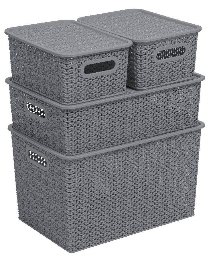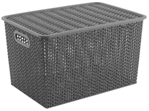 Емкость из пищевого пластика для хранения и переноски мелких аксессуаров и продуктов питания. В объеме 14л корзинки оптимальны для хранения одежды и обуви, овощей, книг и игрушек и пр. С врезными ручками обтекаемой формы корзинки удобно перемещать. Бортик по периметру крышек обеспечивает фиксацию при штабелировании корзинок друг на друга. Узор «Вязь» по всему корпусу и крышке придает корзинкам натуральный вид и делает их легкими и проветриваемыми.