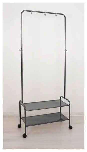Вешалка вмещает до 10 плечиков, а ограничители не дадут им соскользнуть с нее. Перекладина выдерживает нагрузку до 20 кг. На сетчатых полках с лёгкостью помещается до 4 пар обуви. С помощью колесиков вешалку удобно перемещать по комнате. На боковых стойках предусмотрены стильные металлические крючки для хранения сумок и прочих предметов. Максимально простая сборка, инструменты в комплекте, соберут даже дети. Изделие в цветной картонной упаковке с удобной ручкой - легко донести от пункта выдачи до дома и не стыдно вручить в качестве подарка. Вешалка продаётся напрямую от производителя, что гарантирует качество и выгодную цену.