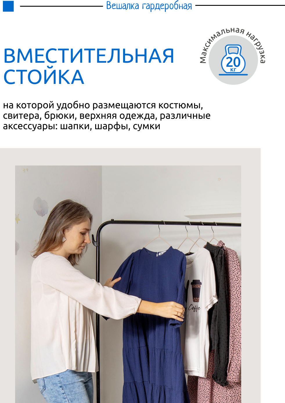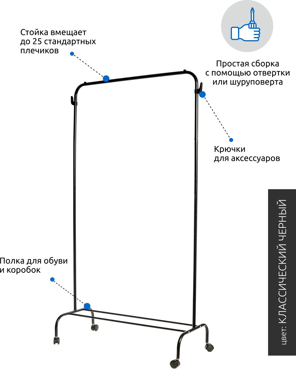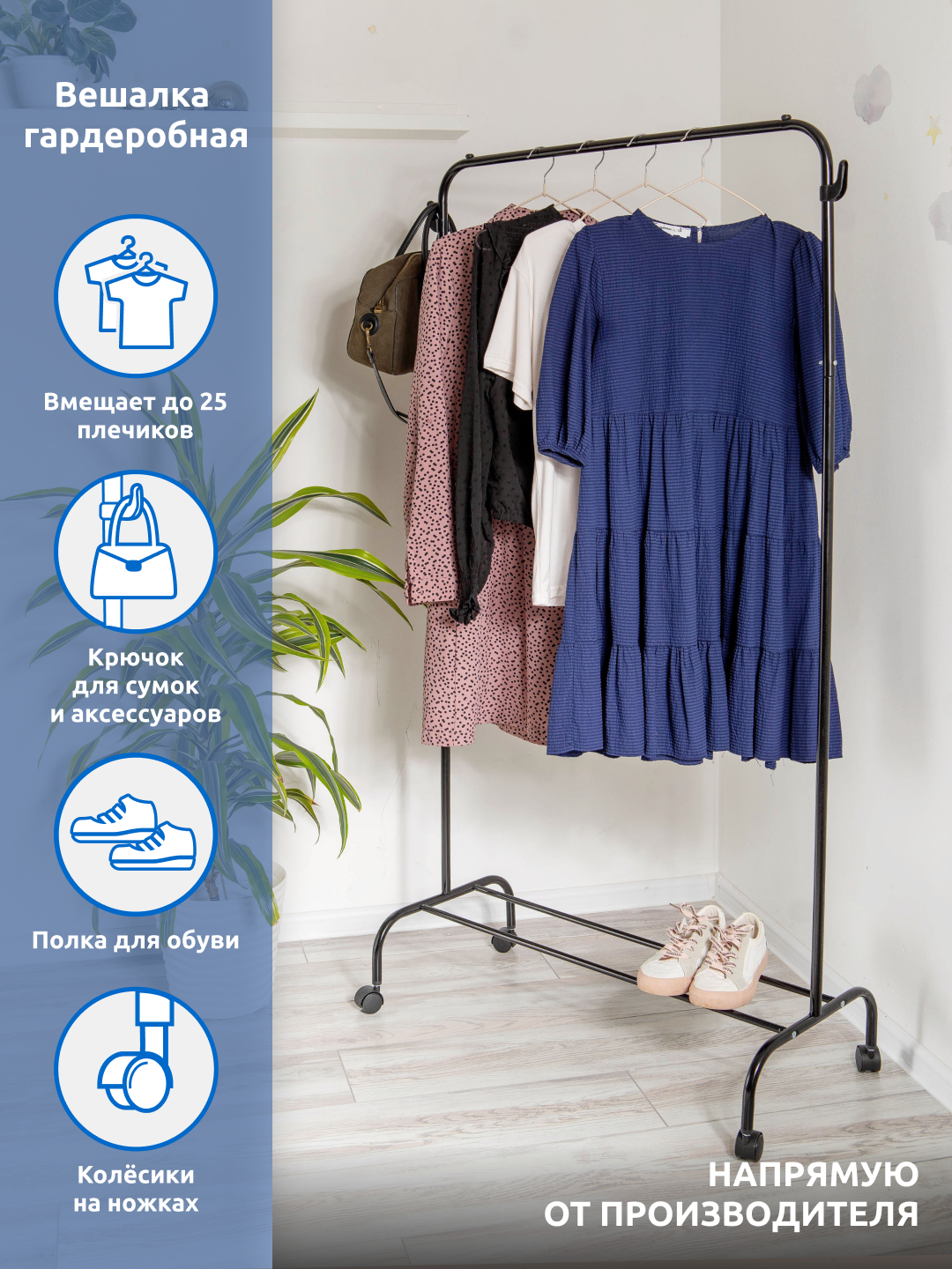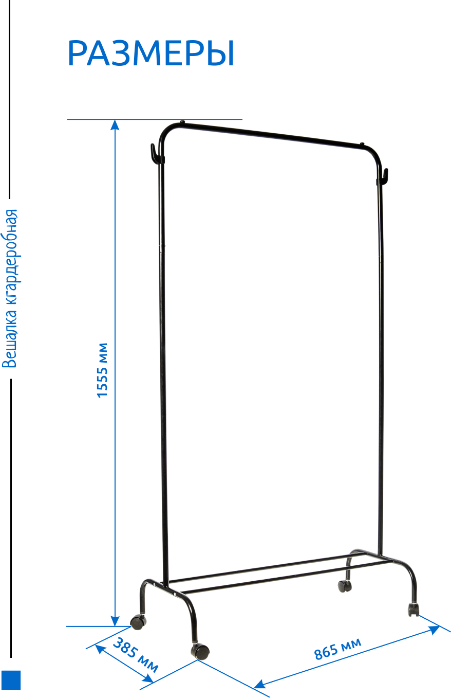 Вешалка напольная гардеробная комфортно разместит до 25 плечиков с одеждой. Металлический каркас, стопперы для плечиков на штанге.
