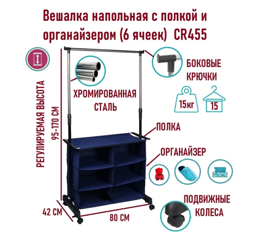 Вешалка напольная с полкой и органайзером предназначена для удобства хранения одежды, обуви, аксессуаров. Она поможет сберечь ваши вещи в идеальном состоянии.