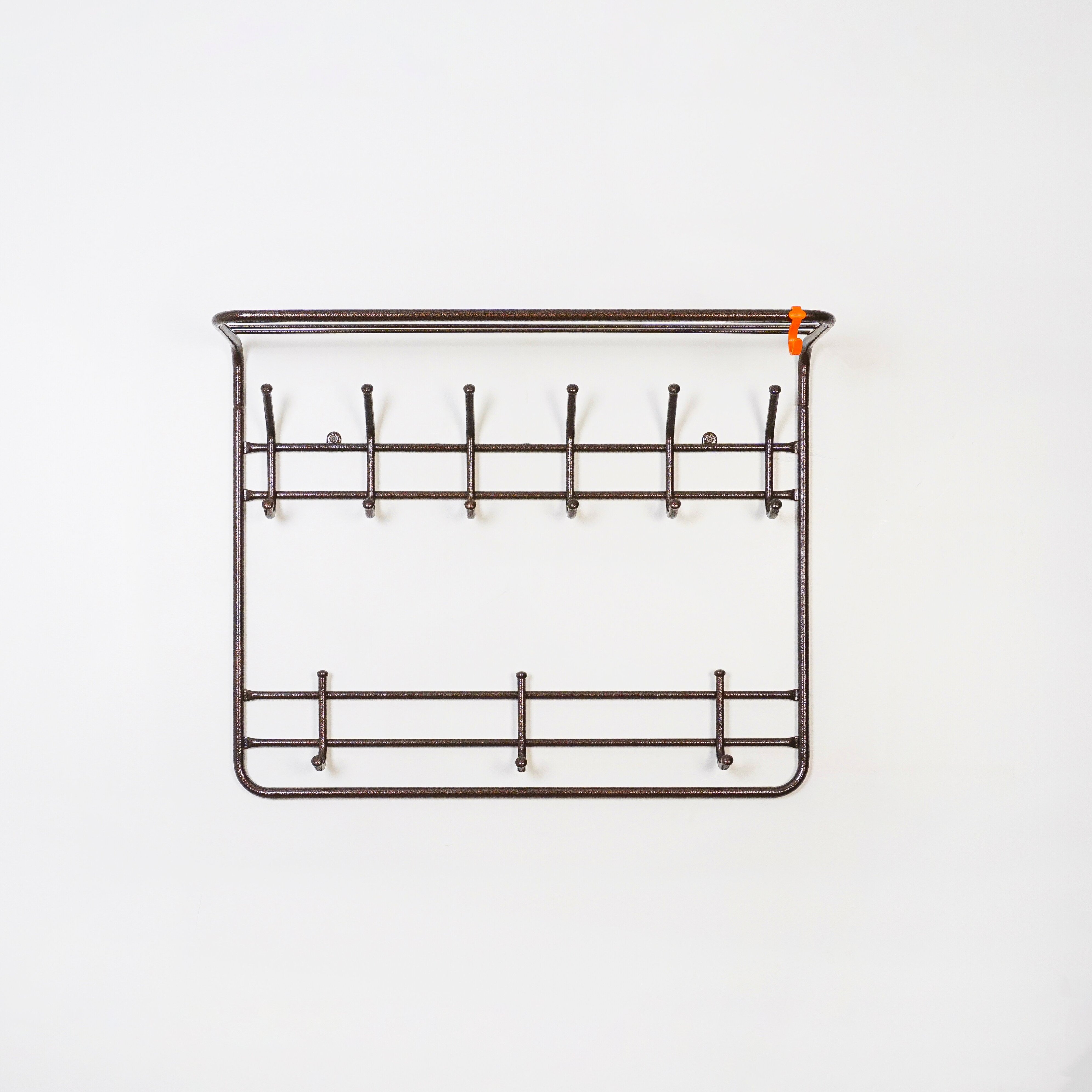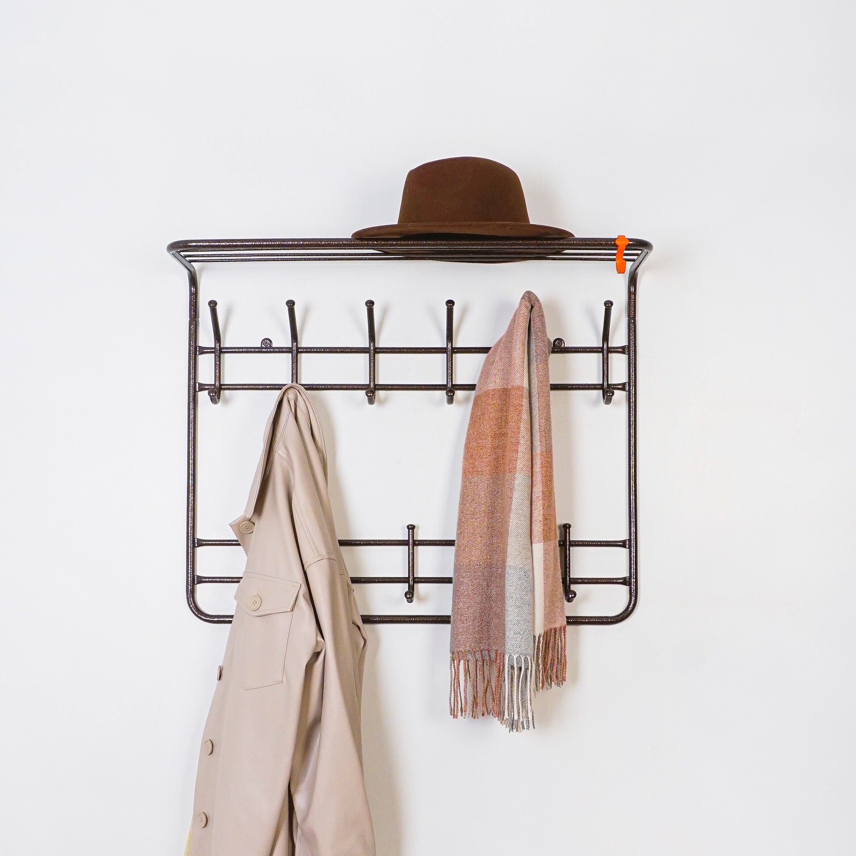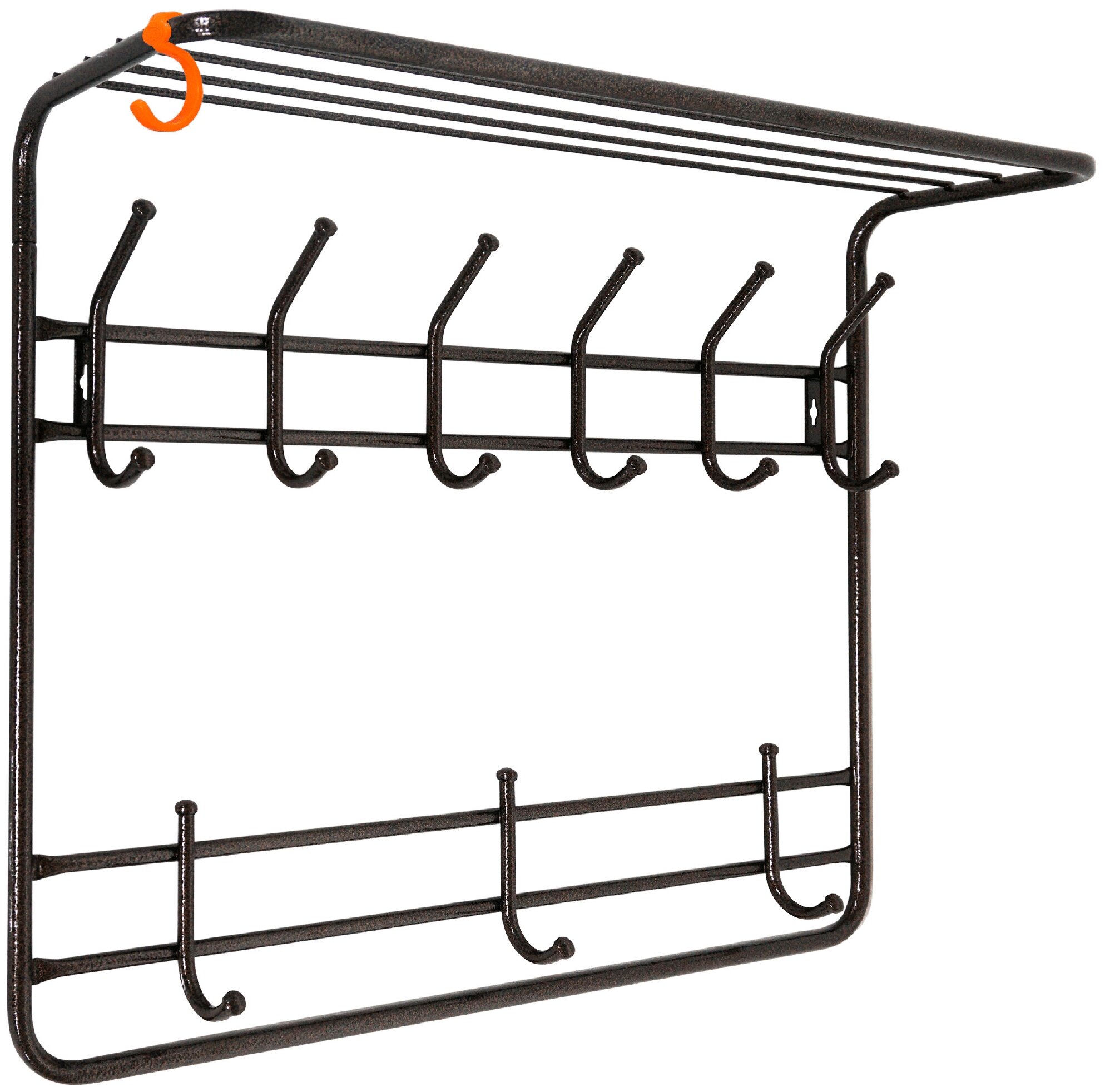 Настенная двухуровневая вешалка с полкой от российского производителя "ЗМИ" создана для хранения одежды в доме, на даче, в офисе и выполнена в классическом стиле. Она долго прослужит владельцу, благодаря материалу, из которого изготовлена - сталь и полимерно-порошковое покрытие. Вешалка имеет 9 металлических крючков - каждый из них может выдерживать до 5 кг постоянной нагрузки. Металлические колпачки будут держаться на крючках весь срок службы вешалки, благодаря особой технологии запрессовывания. На полке можно разместить головные уборы. В комплекте идет пластиковый крючок для различных мелочей. Вешалка продается в разобранном виде в коробке с ручкой, что позволяет с удобством донести ее до дома с пункта выдачи. Сборка осуществляется без инструмента. Продаётся напрямую от производителя, что гарантирует качество и выгодную цену