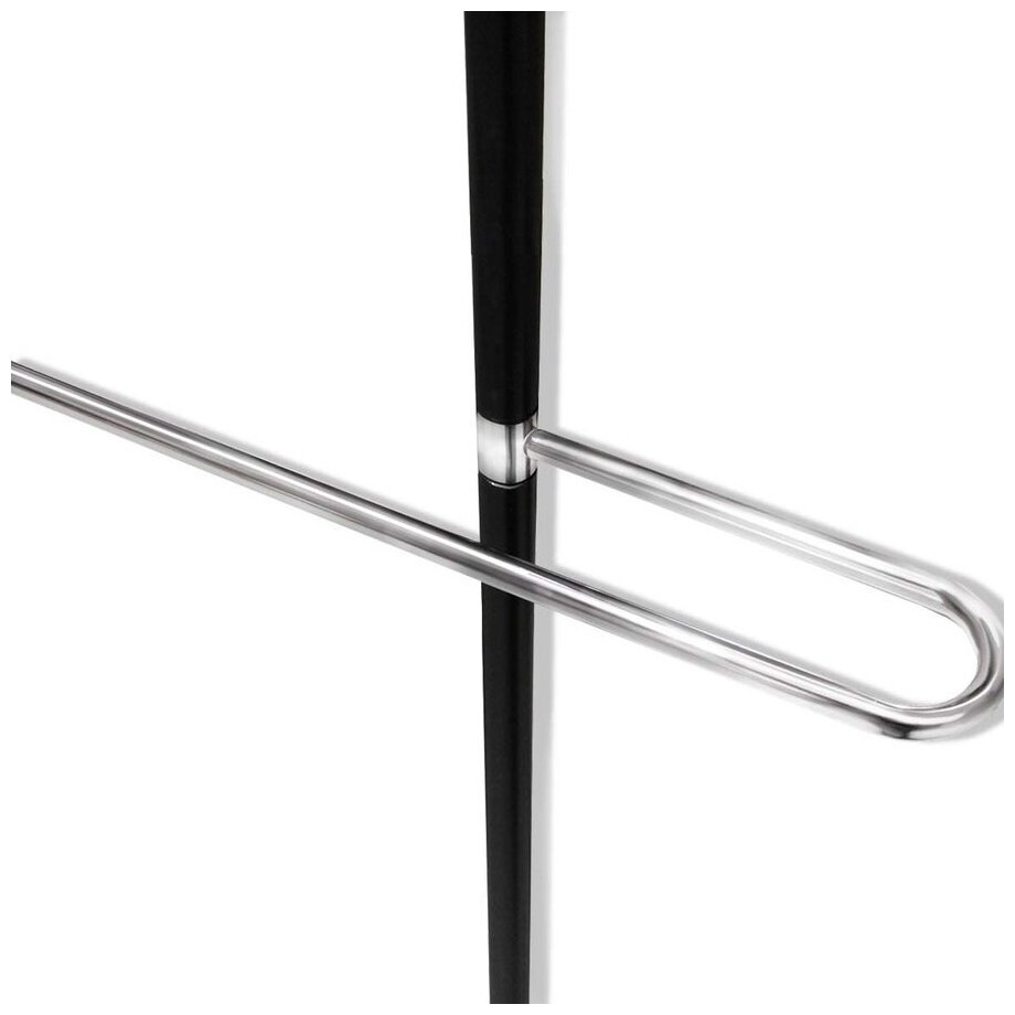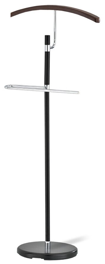 Вешалка выполнена из хромированной трубы и МДФ. Металлическая стойка отделана PVC пленкой под дерево.
