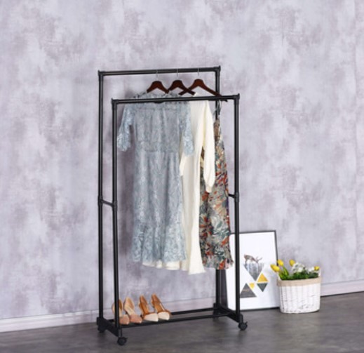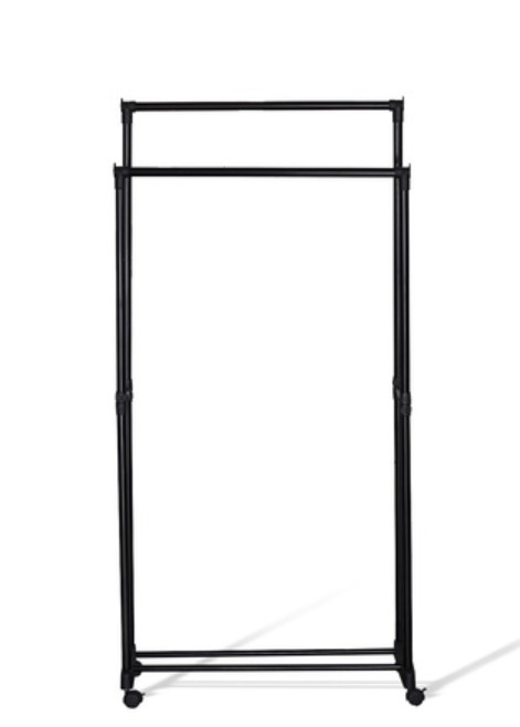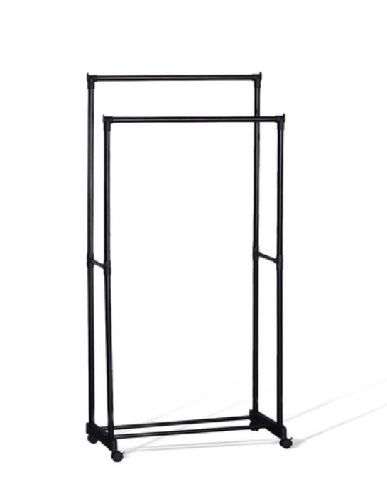 Штанга, стойки и полка выполнены из металлической трубы. Высота вешалки не регулируется. Ширина штанги позволяет вместить до 20 вешалок-плечиков;