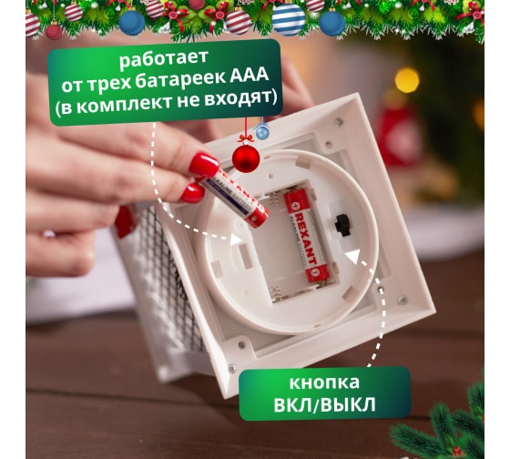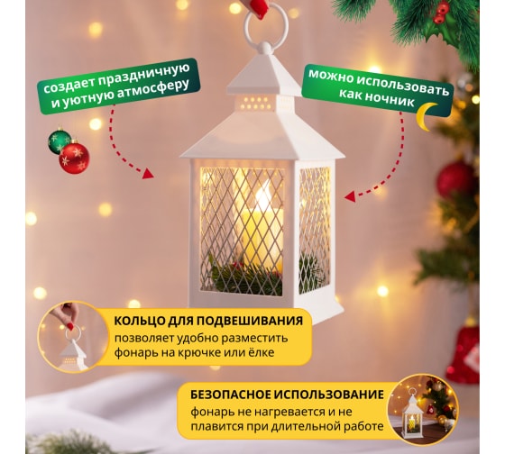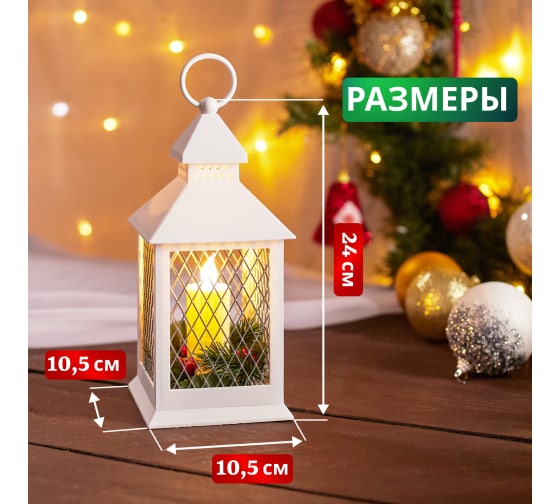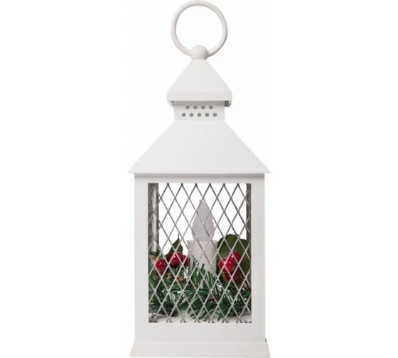 екоративный фонарь со свечкой — эффектное украшение, которое символизирует Рождество и Новый год, поэтому станет запоминающимся подарком к празднику. В белом корпусе настольного светильника находится оригинальная композиция с искусственными ветками ели и ягодами остролиста. А главный компонент — свеча, внутри которой спрятан 1 диод, излучающий теплый белый свет. Можно безопасно использовать как ночник для сна детский. Декоративный фонарь работает от 3 батареек типа ААА, включается и выключается при помощи кнопки на корпусе. Новогодний фонарь подсвечник предназначен для использования в интерьере.