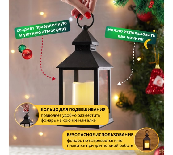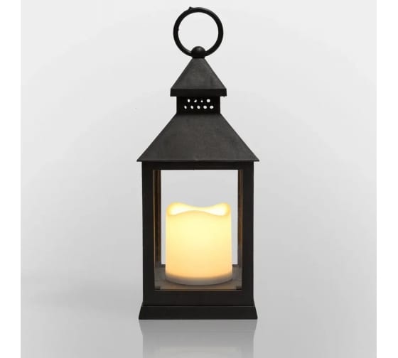 Декоративный фонарь со свечкой — оригинальное интерьерное украшение, которое принесет уют и тепло в ваш дом. Изделие предназначено для использования в интерьере. Декоративный элемент подсвечивается одним диодом, имитирующим теплое пламя свечи. Корпус черного цвета имеет высоту 24 см. Для размещения в подвешенном виде предусмотрено кольцо. Фонарь питается от 3 батареек типа ААА, специальный отсек закрывается при помощи крышки.
