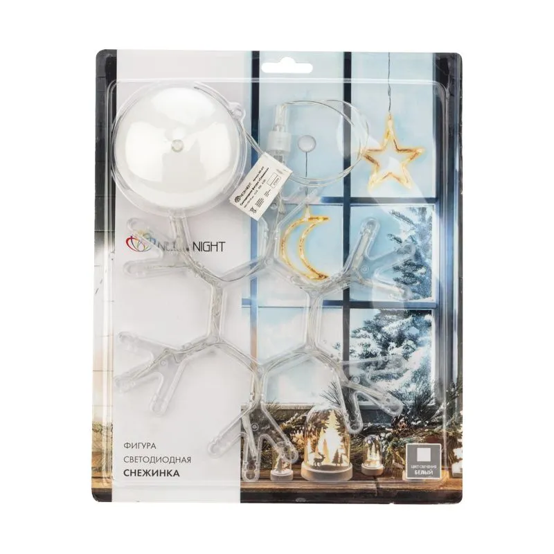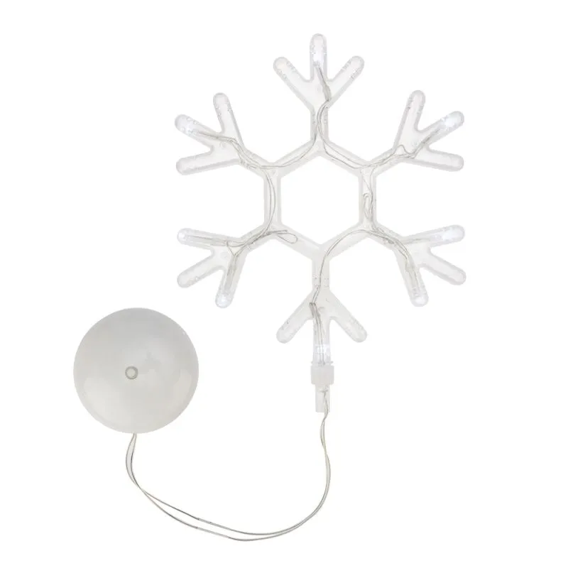 Светодиодная фигура «Снежинка» на присоске с подвесом гармонично дополнит интерьер детской, гостиной, кухни, наполнит помещение ярким белым свечением задорных огоньков, подарит праздничное настроение взрослым и детям. 8 безопасных диодов питаются от трех мизинчиковых батареек (тип ААА). Одного комплекта элементов хватает на 150 часов непрерывной работы. Удобная присоска, расположенная на батарейном блоке, надежно фиксирует изделие на гладких поверхностях. Гибкий шнур в прозрачной оболочке из ПВХ имеет длину 20 см.