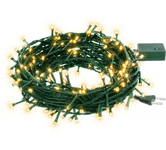 VEGAS Электрогирлянда "Нить" 200 теплых LED ламп, контроллер 8 режимов, зеленый провод, 20 м, 220 v 55068 для создания декоративной и праздничной иллюминации. Электрогирлянды "Нить" предназначены для декорирования жилых и торговых помещений (елок, декоративных растений, предметов интерьера, колонн и других архитектурных элементов). Использовать внутри помещений.