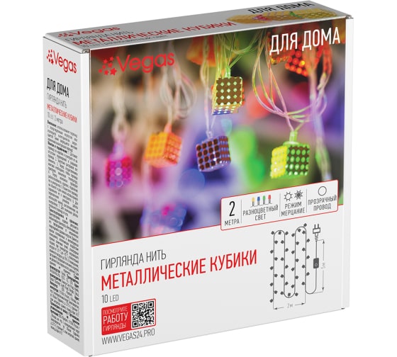 Электрогирлянда VEGAS Нить Металлические кубики 2 м + 5 м шнур до питания 55172 предназначена для декорирования жилых и торговых помещений (елок, декоративных растений, ваз, картин и других предметов интерьера). С её помощью можно также декорировать одежду или прическу.