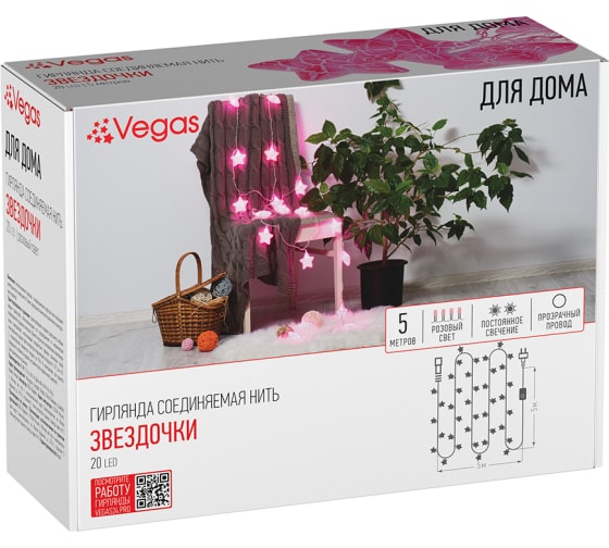 Электрогирлянда VEGAS Нить Звездочки 5м + 5 м шнур до питания 55176 предназначена для декорирования жилых и торговых помещений (елок, декоративных растений, ваз, картин и других предметов интерьера). С её помощью можно также декорировать одежду или прическу.