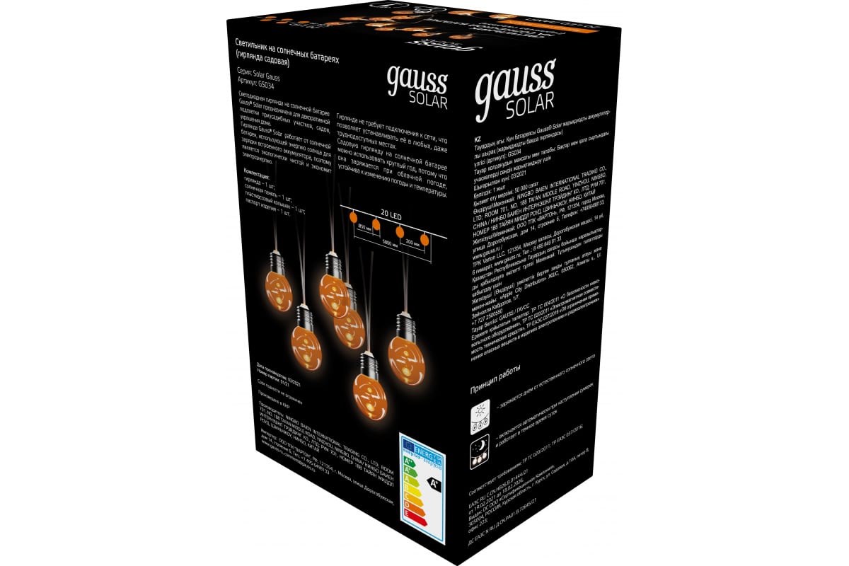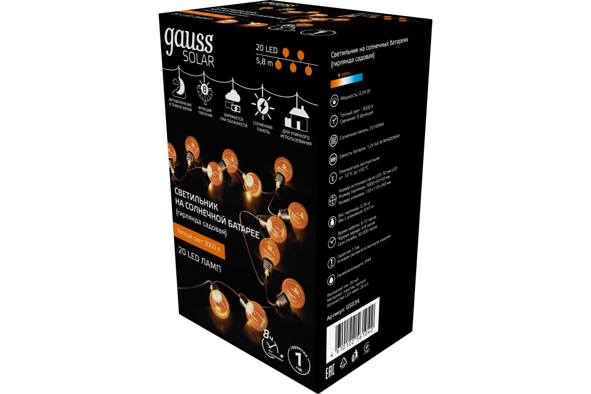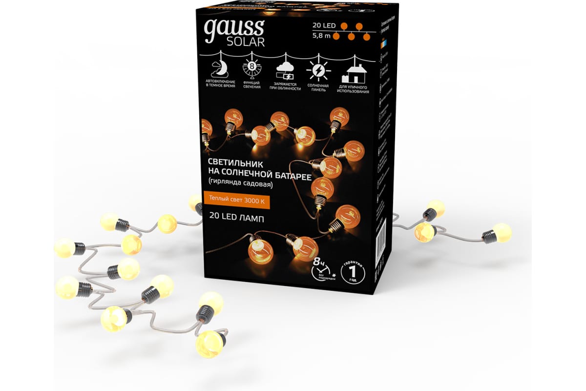 Садовая гирлянда на солнечной батарее Gauss Solar, 20 LED ламп, большие шары, белый свет GS034 излучает теплое белое свечение и работают от солнечных лучей. Ее можно использовать для украшения беседок, деревьев, гаражей, столбов или любой комнаты для создания уютной атмосферы.