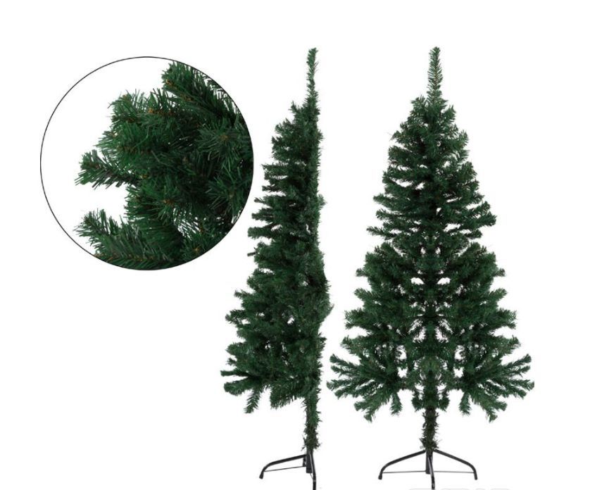 Пристенная искусственная ель в виде половинки высотой 150 см используется для украшения помещения к празднику Нового Года.