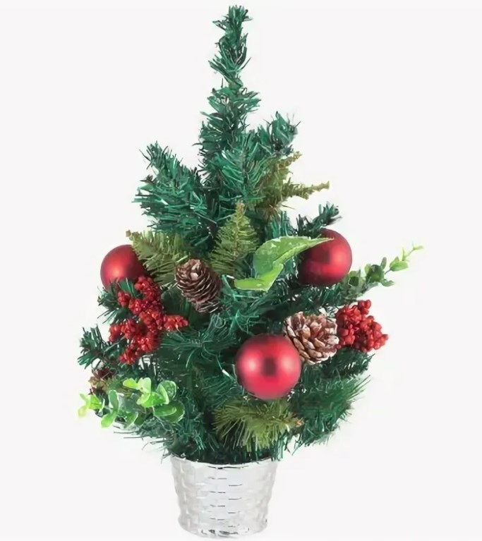 Яркая елочка может помочь создать праздничное настроение. Ее можно разместить на любой ровной поверхности. Она украшена шариками, шишками. Цвета декоративных элементов - красный. Изделие прослужит долго благодаря материалу, из которого оно сделано.