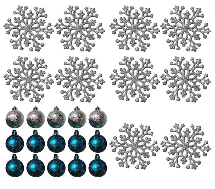 кол-во и цвет: 10 шт синий цвет, 5шт серебро, 10шт снежинок серебро.