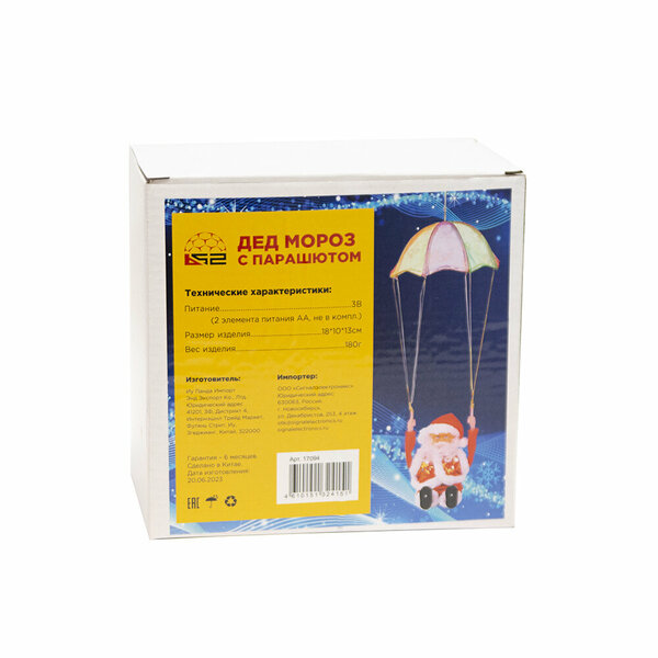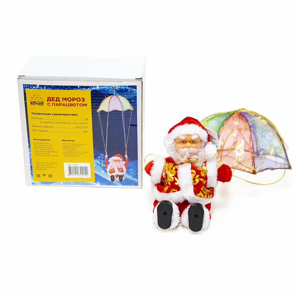 Дед мороз с парашютом – это оригинальная деталь для украшения дома к празднику. Ее можно разместить на елке, окне, дверном проеме и наслаждаться забавным Дедом Морозом. Работает игрушка от батареек.