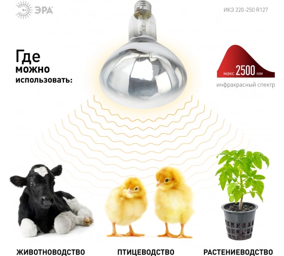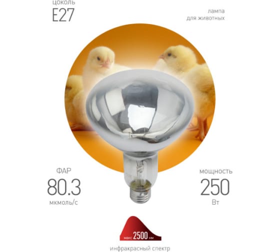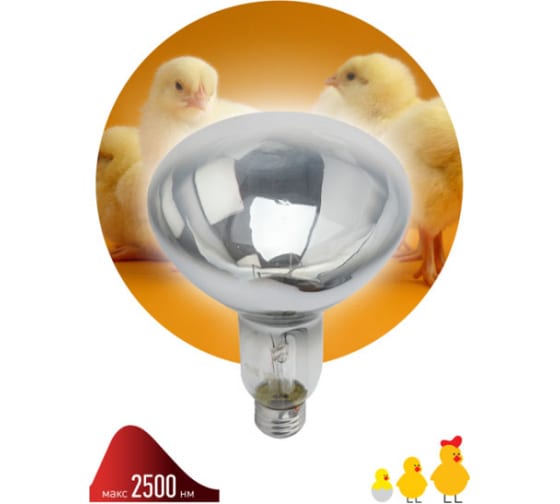 Инфракрасная лампа ЭРА ИКЗ 220250 R127, E27 Б0042991 зеркальная лампа с прозрачной колбой. Совмещает тепловой и осветительный эффект. Универсальный источник света и тепла. Применяется как для обогрева, так и для освещения. Активно используется в животноводстве, птицеводстве и растениеводстве. Подходит для эффективного обогрева как жилых, так и производственных помещений, а также для досветки растений. 100% энергии переходит в тепловую.