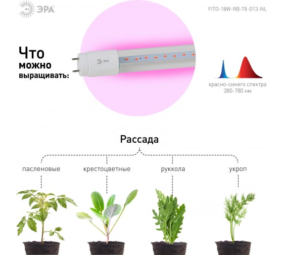 Лампа ЭРА красносинего спектра FITO-18W-RB-Т8-G13-NL 18 Вт Т8 G13 Б0042990 станет отличным выбором для выгонки зелени, а также выращивания листового салата, рассады помидоров и других видов пасленовых. Кроме того, с помощью этого светильника Вы также сможете разводить и некоторые виды декоративных растений.