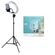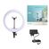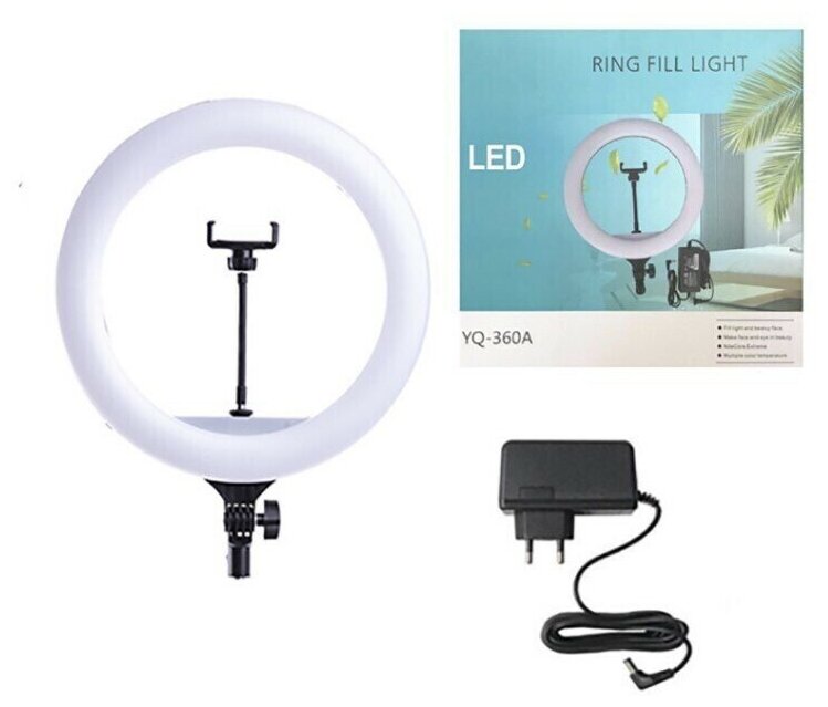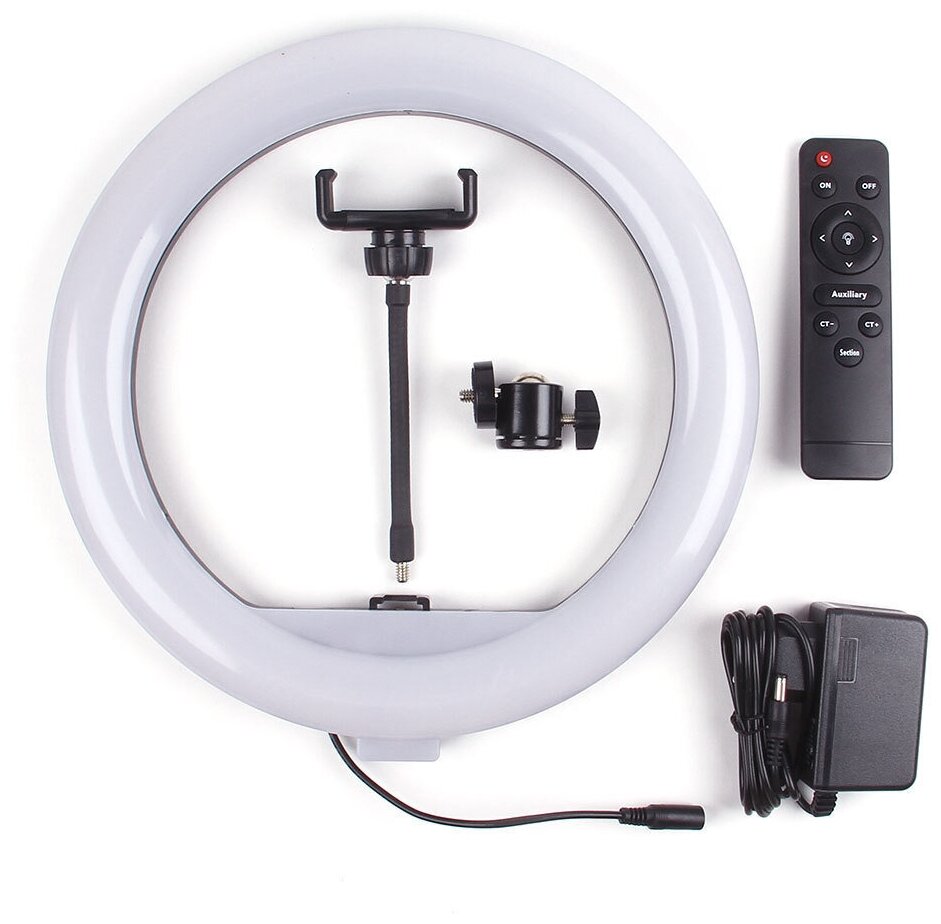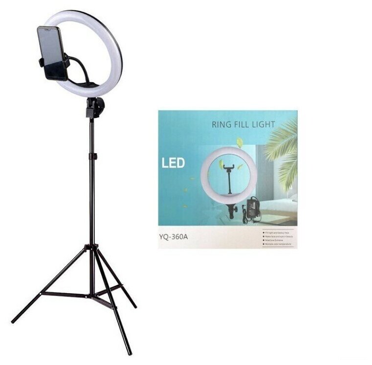 регулировка цветовой температуры, стойка в комплекте, регулировка яркости освещения, держатель для смартфона