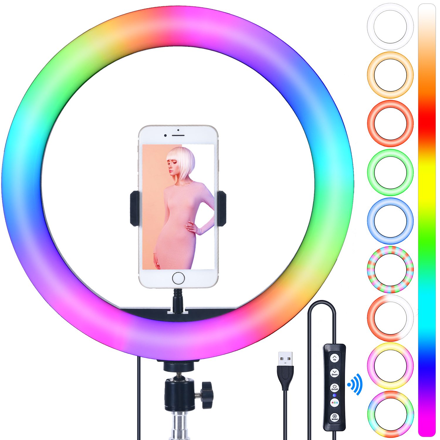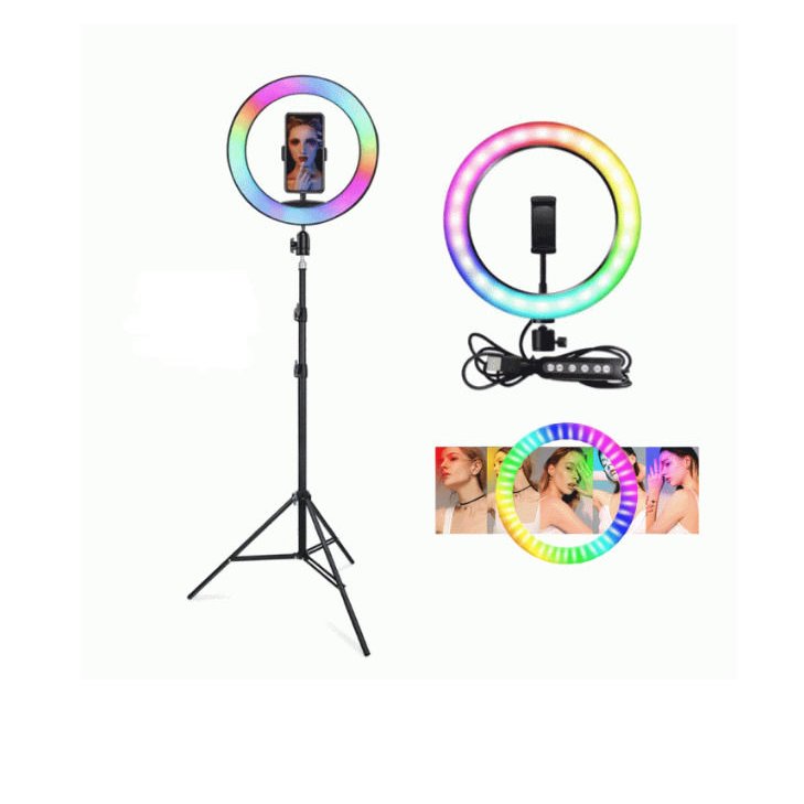 Кольцевая RGB LED лампа MJ26 (26см)+держатель для телефона с цветными режимами света+штатив(металл)1.9м