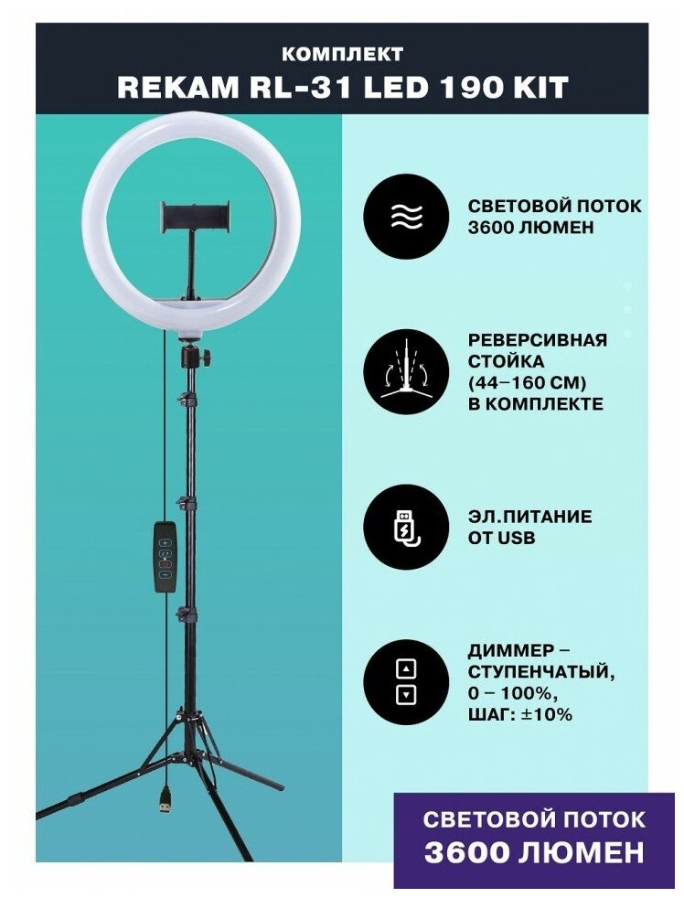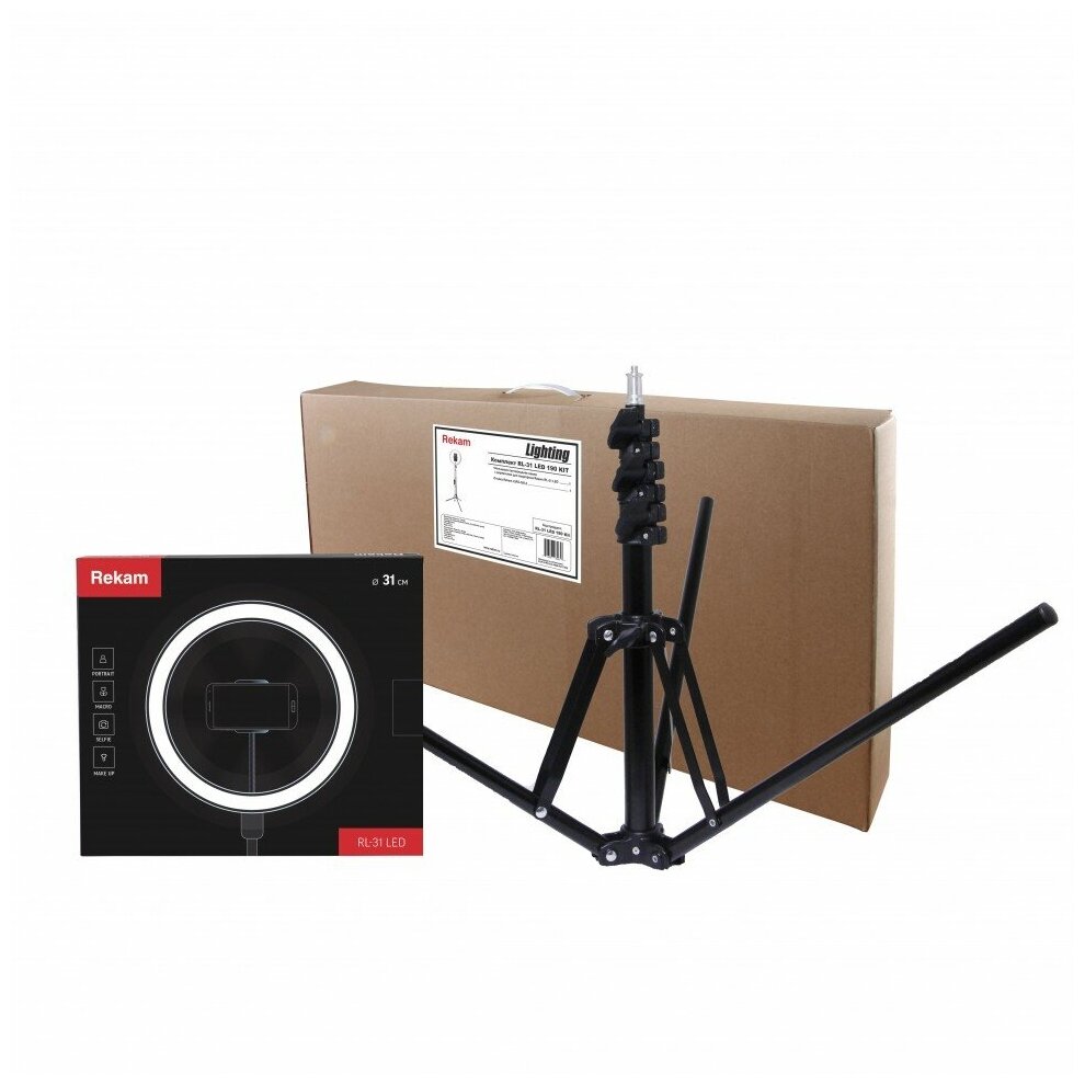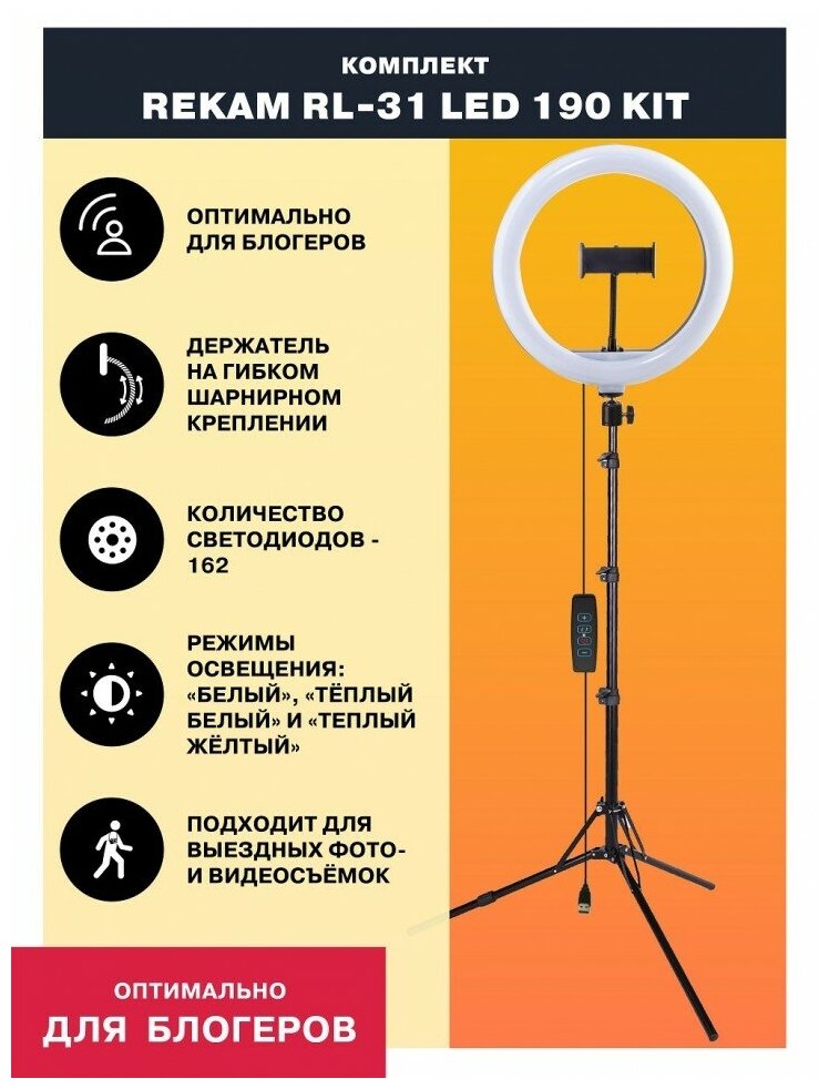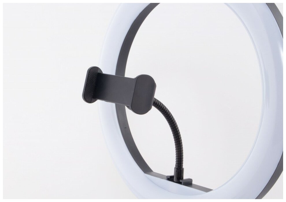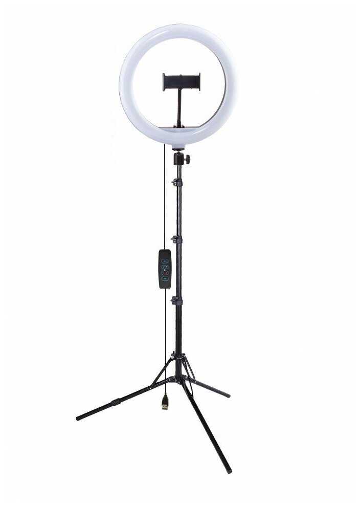 Кольцевая светодиодная лампа. Шнур питания с пультом и USB-разъёмом. Держатель для смартфона. Гибкое шарнирное крепление (Goose neck). Крепление на стойку (штатив) с интегрированной шаровой головой. Винт регулировки угла наклона лампы. Студийная стойка (до 160 см). Инструкция. Гарантийный талон