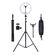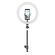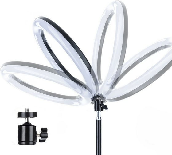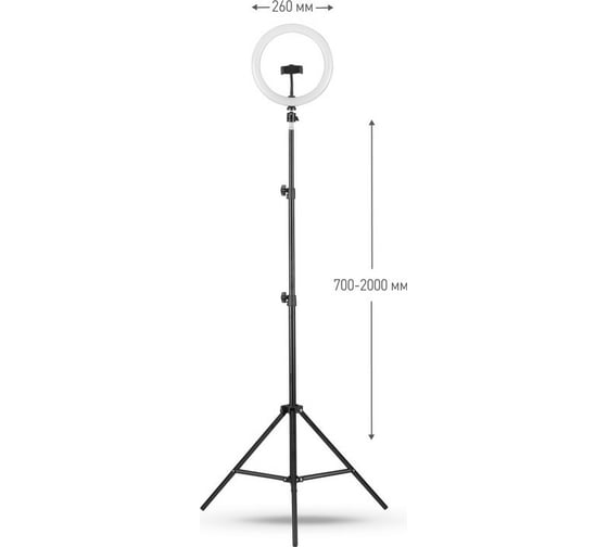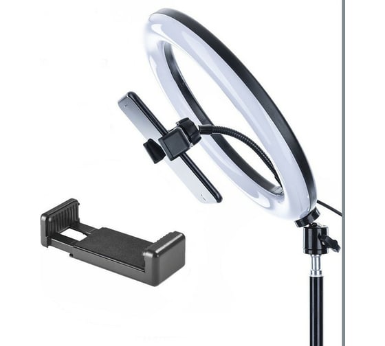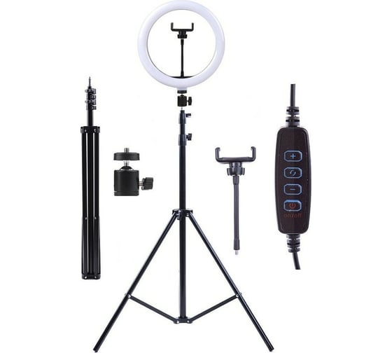 Модель имеет удобный кнопочный пульт управления светом на проводе питания, позволяющий регулировать цветовую температуру 3500К … 6000К и устанавливать комфортный уровень яркости (10 ступеней). Подключение светильников производится к разъёмам USB 5В,2А сетевых адаптеров, компьютеров, аккумуляторных накопителей энергии. Зажим смартфона установлен на гибком металлическом кронштейне.зажим удерживает телефон шириной 6-8,5 см. Мощность 10 Вт, имеет плафон диаметром 26 см, установленный на металлическом подвижном шарнире, позволяющем устанавливать и фиксировать кольцевую лампу под любым углом наклона . Светильник напольный - устанавливается на надежный регулируемый по высоте ( 70-200 см) металлический штатив.