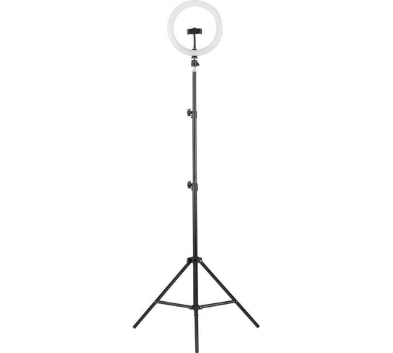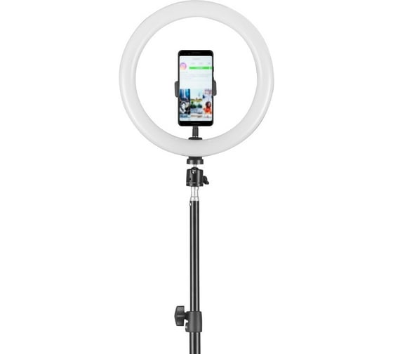 Светильник светодиодный с кольцевым плафоном и держателем смартфона. Часто подобные светильники называют лампами для блогеров или селфи-лампами.
