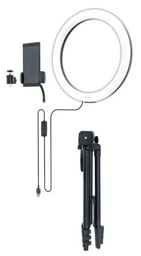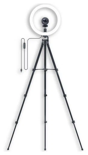 Элементы управления: физические кнопки на контроллере, расположенном на кабеле, для регулировки яркости и цвета, Варианты установки: штатив с шаровым креплением с винтом 1/4 дюйма и держатель для мобильного телефона Кольцо подсветки: пластик/металл Штатив: алюминиевый сплав Внешний диаметр кольца подсветки: 30 см Внутренний диаметр кольца подсветки: 24,1 см Кольцо подсветки: 260 г Штатив: 550 г Высота штатива: мин. 40 см, макс. 135 см Держатель телефона: 7,25 см x 4,73 см x 18,75 см, с мягкой подкладкой и возможностью расширения от 4,95 см до 8,0 см