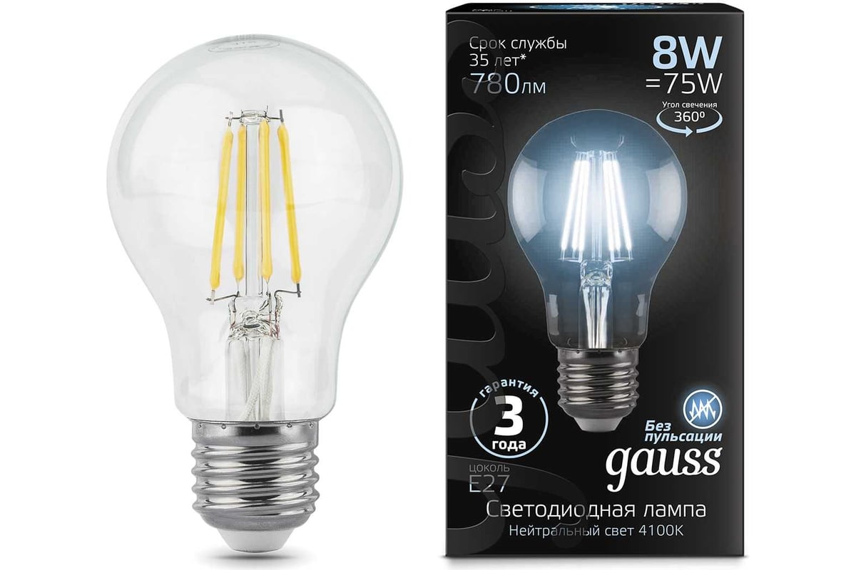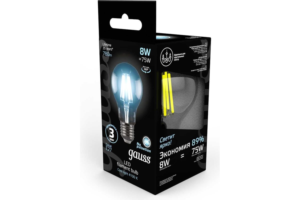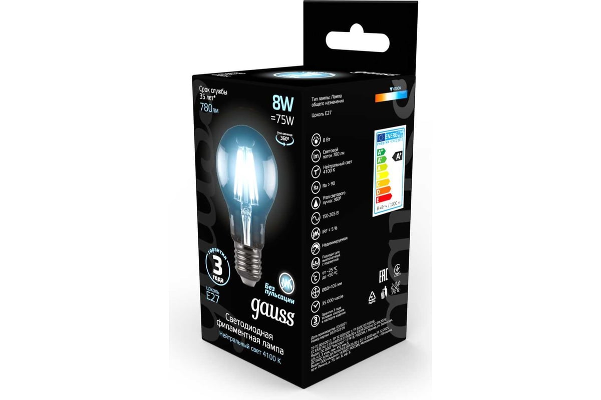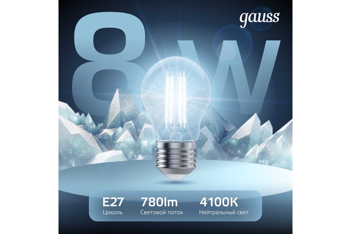 Технические характеристики Gauss LED Filament A60 E27 8W 780lm 4100К 102802208