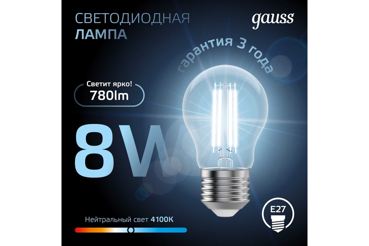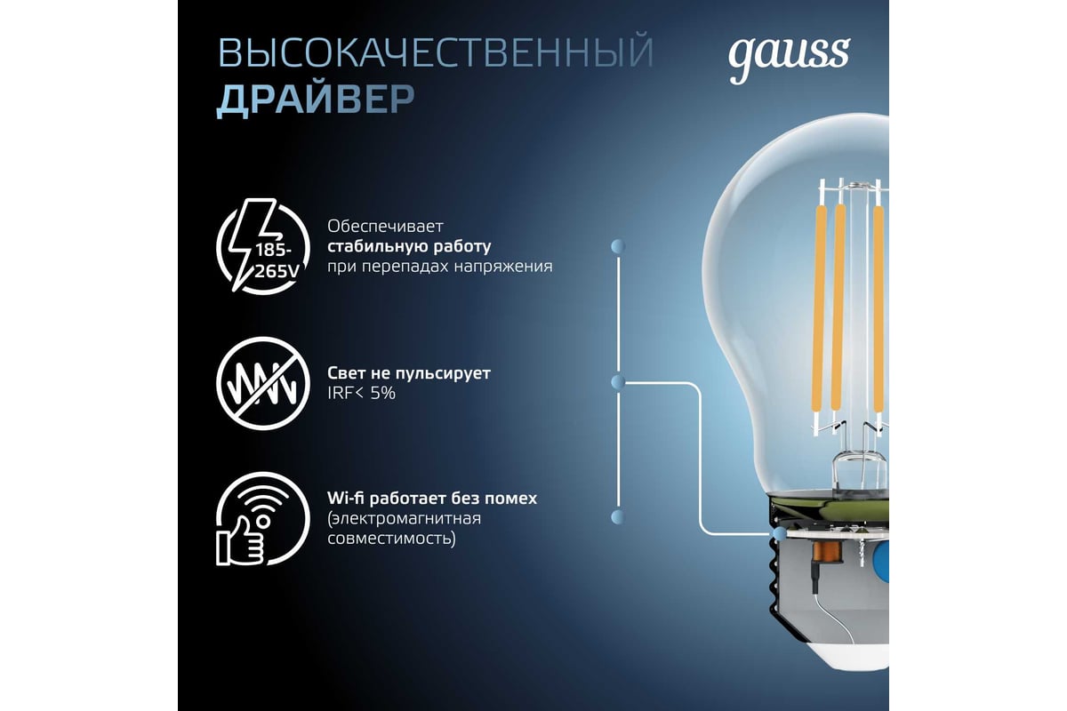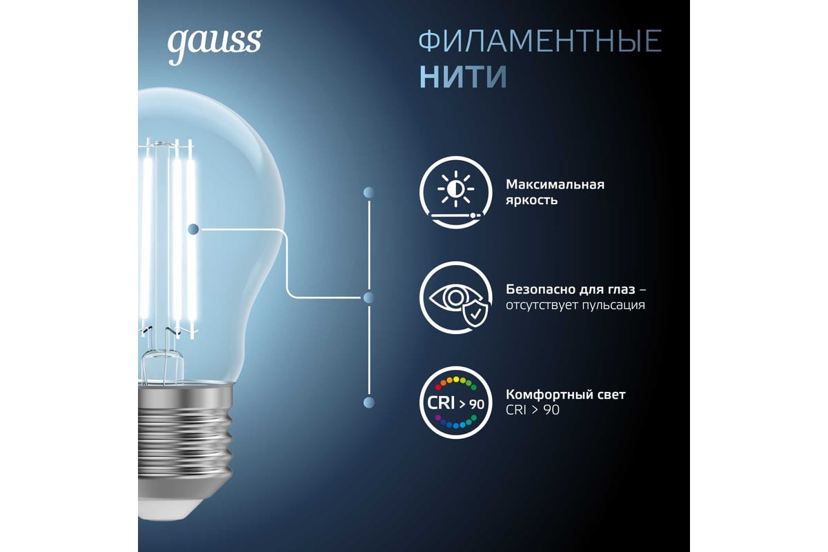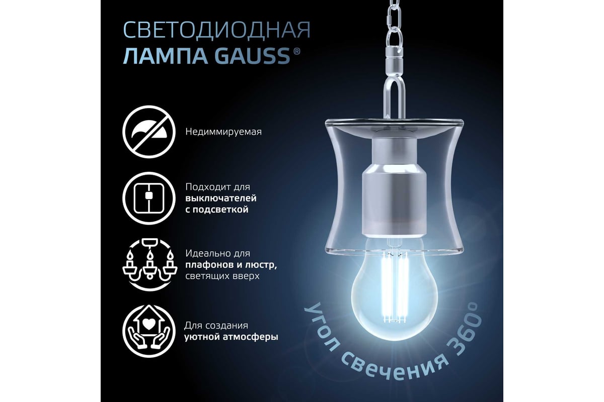 Светодиодные филаментные лампы GAUSS - это новейшие технологии в светотехнике. Лампы имеют привычный вид классических ламп накаливания, освещают пространство на 360и дают больше света по сравнению с обычными светодиодными лампами за счет прозрачной колбы.