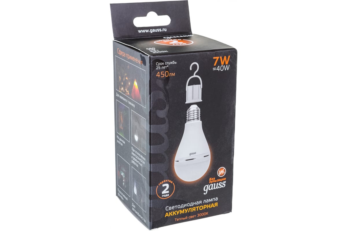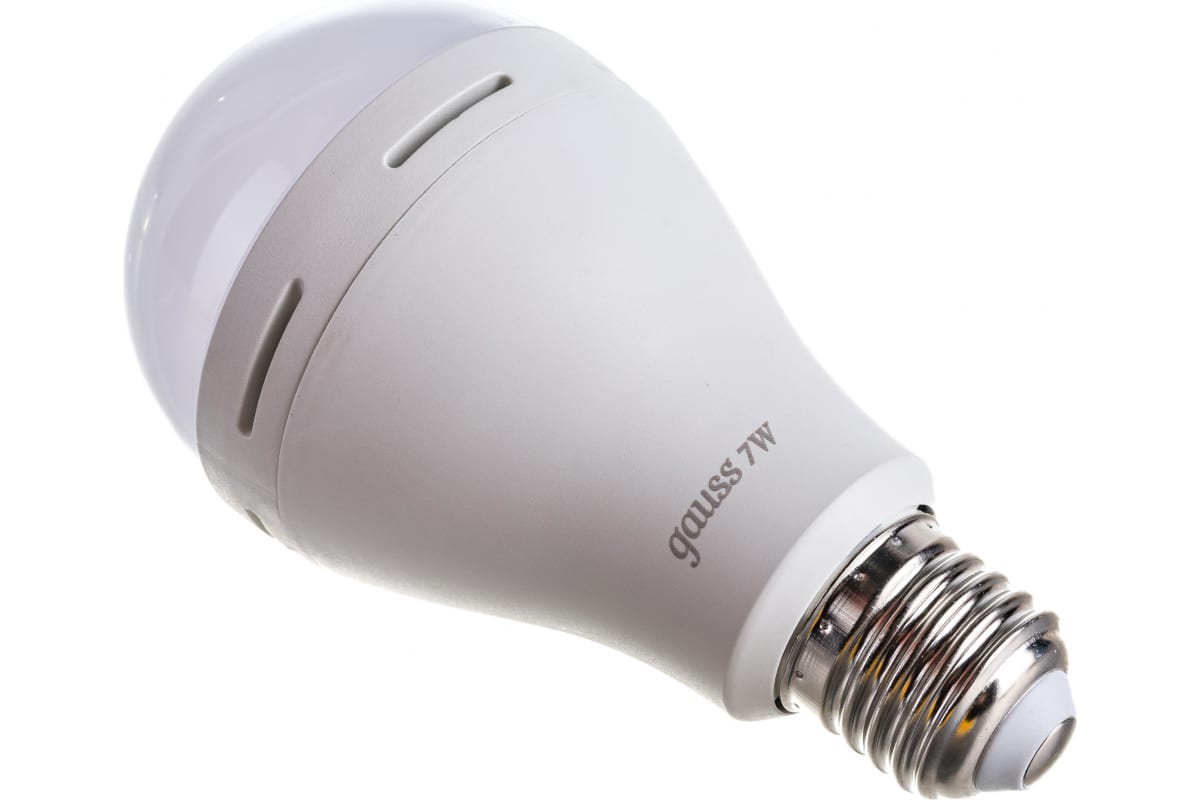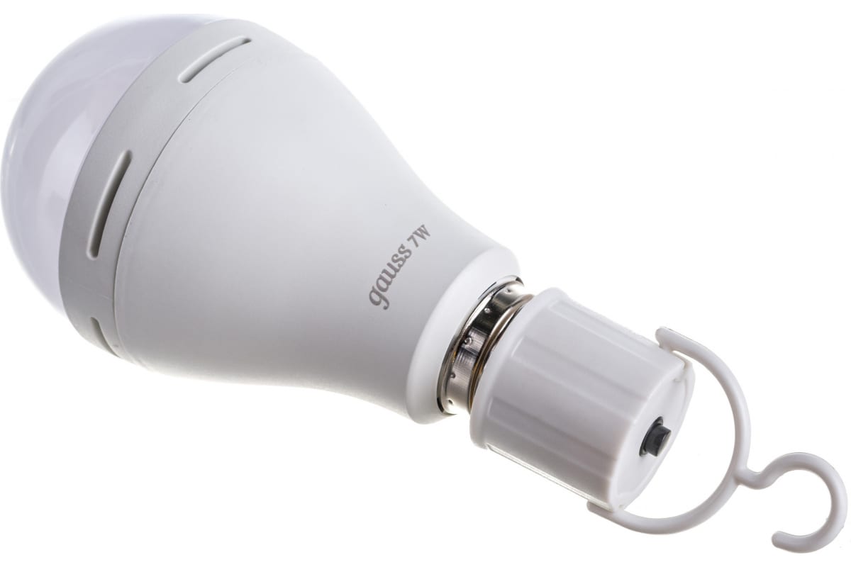 Лампа Gauss LED A60 7W E27 450lm 3000K с Li-Ion аккумулятором 102402107 станет незаменимым помощником за пределами цивилизации. Лампу можно взять их с собой в путешествие на машине, на пикник, кемпинг или в загородный дом. Помимо мобильности она будет полезна и при аварийных ситуациях. Внезапные перепады напряжения могут возникнуть во время сбоев электричества, аварий на станциях, либо из-за неправильной организации электропроводной системы.