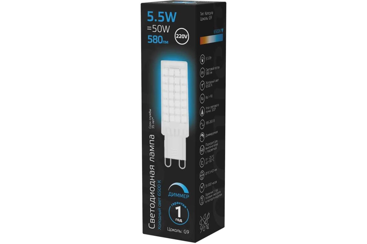 Диммируемая лампа Gauss G9 AC185-265V 5,5W 580lm 6500K керамика LED 1/10/200 107309355-D - идеальная альтернатива устаревшим галогенным лампам для установки в люстры и точечные светильники. Сочетает небольшой размер с отличной яркостью и широким углом освещения.