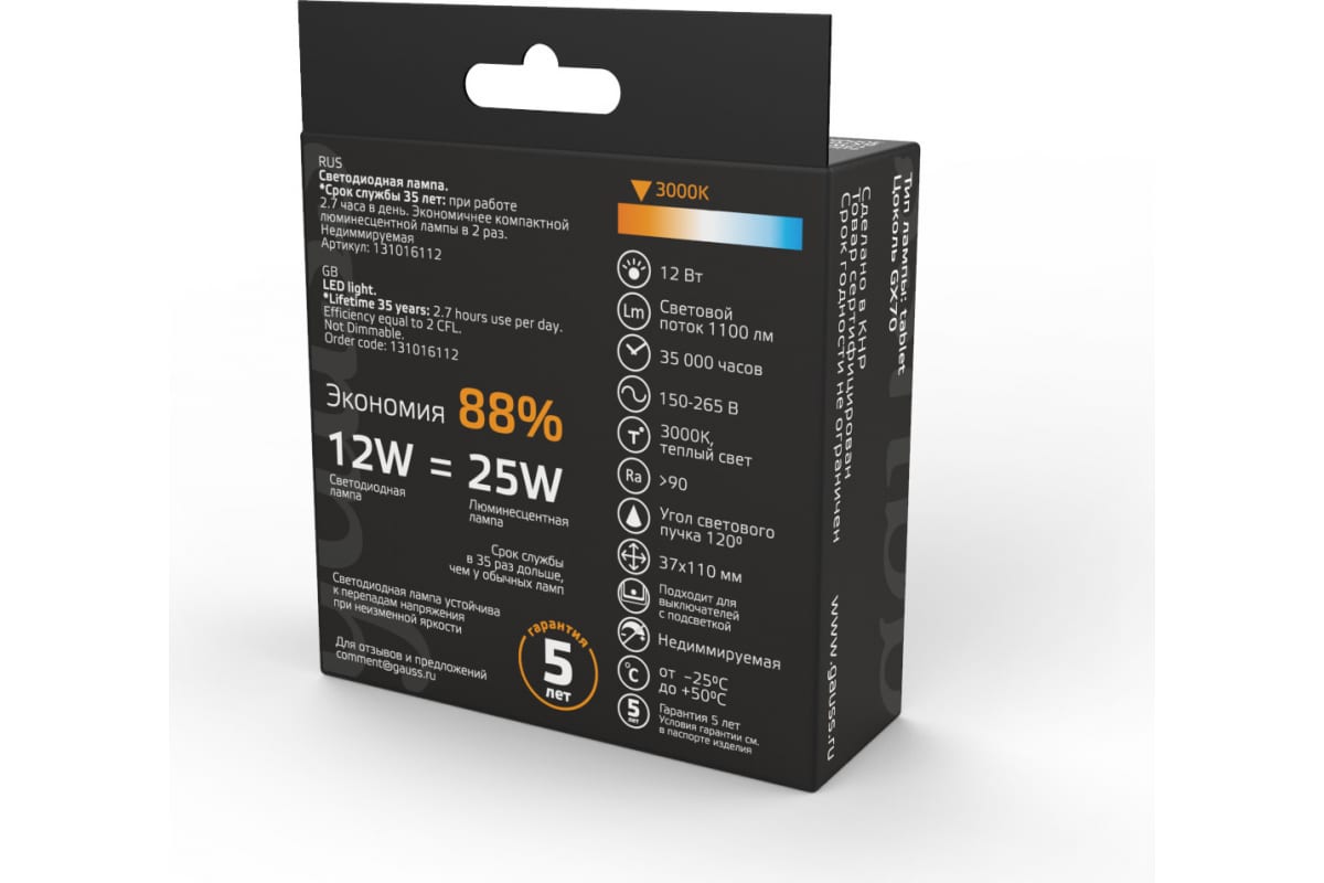 Лампа LED Gauss GX70 12W AC150-265V 3000K - самое лучшее решение для натяжных, подвесных и реечных потолков. Лаконичный дизайн и элегантная простота отлично гармонируют с различными потолками. Малое энергопотребление, и хорошие технические характеристики.