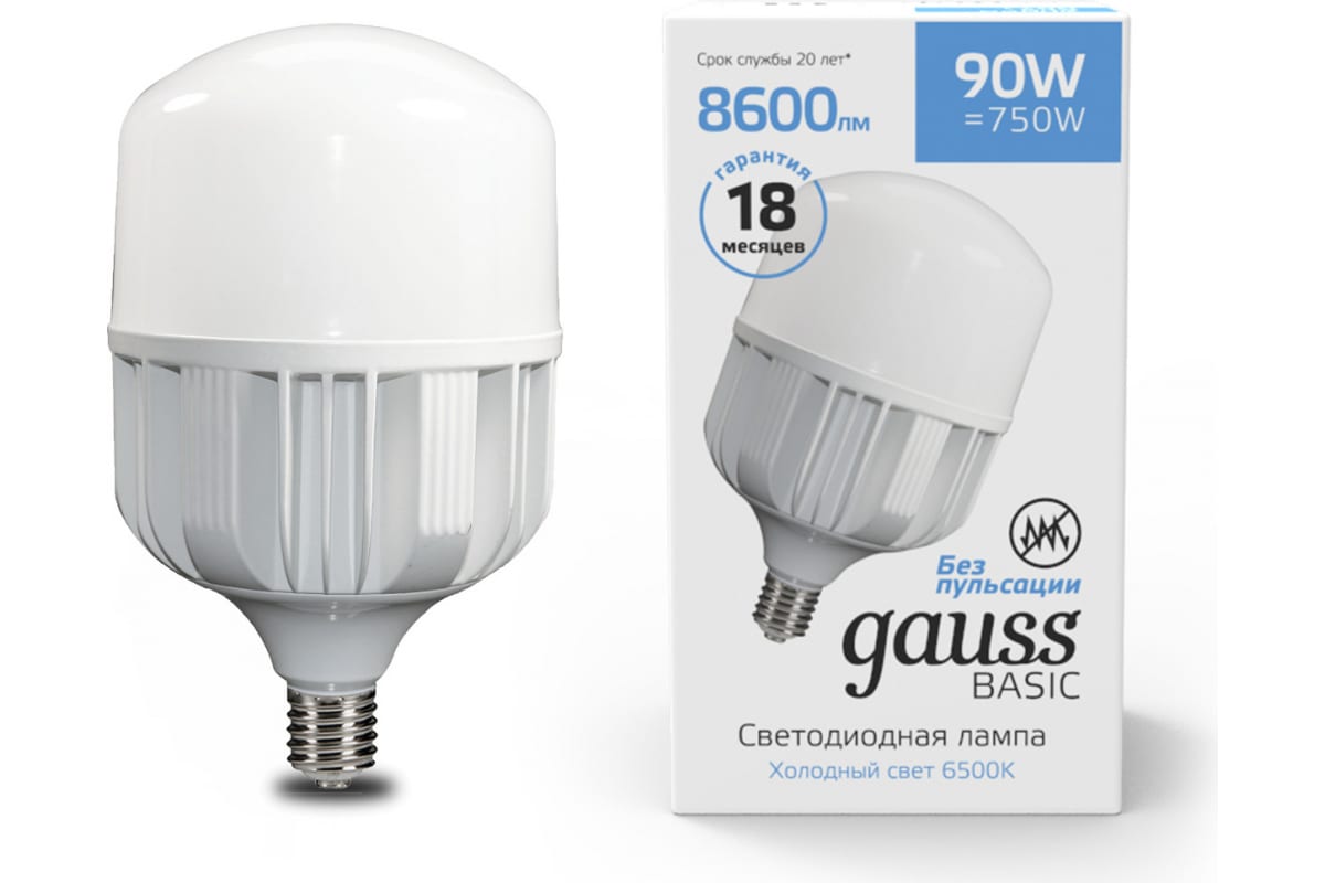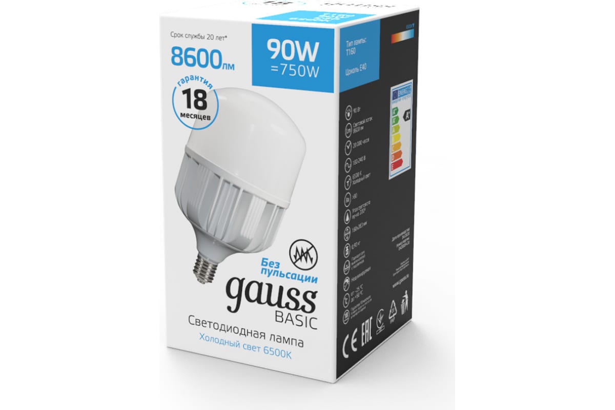 Лампа Gauss Basic, T160, AC180-240V, 90W, 8600lm, 6500K, E40, LED, 1/6 11734392 используется в освещении помещений большой площади и высокими потолками (от 3,5 метров), а также уличных системах освещения. Высокая мощность и большой световой поток при минимальном энергопотреблении.