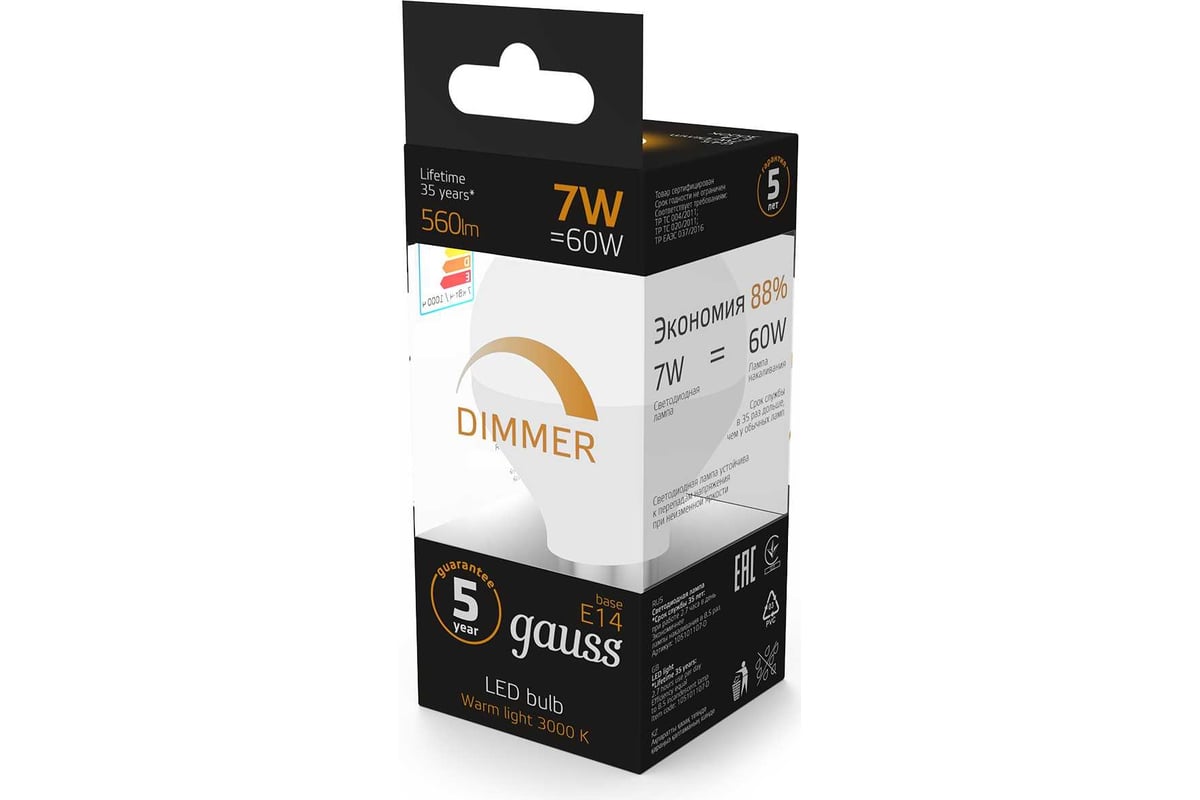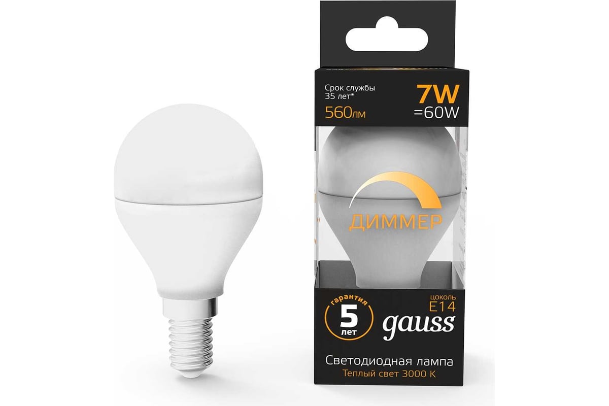 Лампа GAUSS LED Шар-dim E14 7W 560lm 3000К 105101107-D надежный источник освещения высокого качества. Благодаря использованию качественных комплектующих и современных технологий лампы этой серии имеют один из самых высоких показателей энергоэффективности и долговечности.