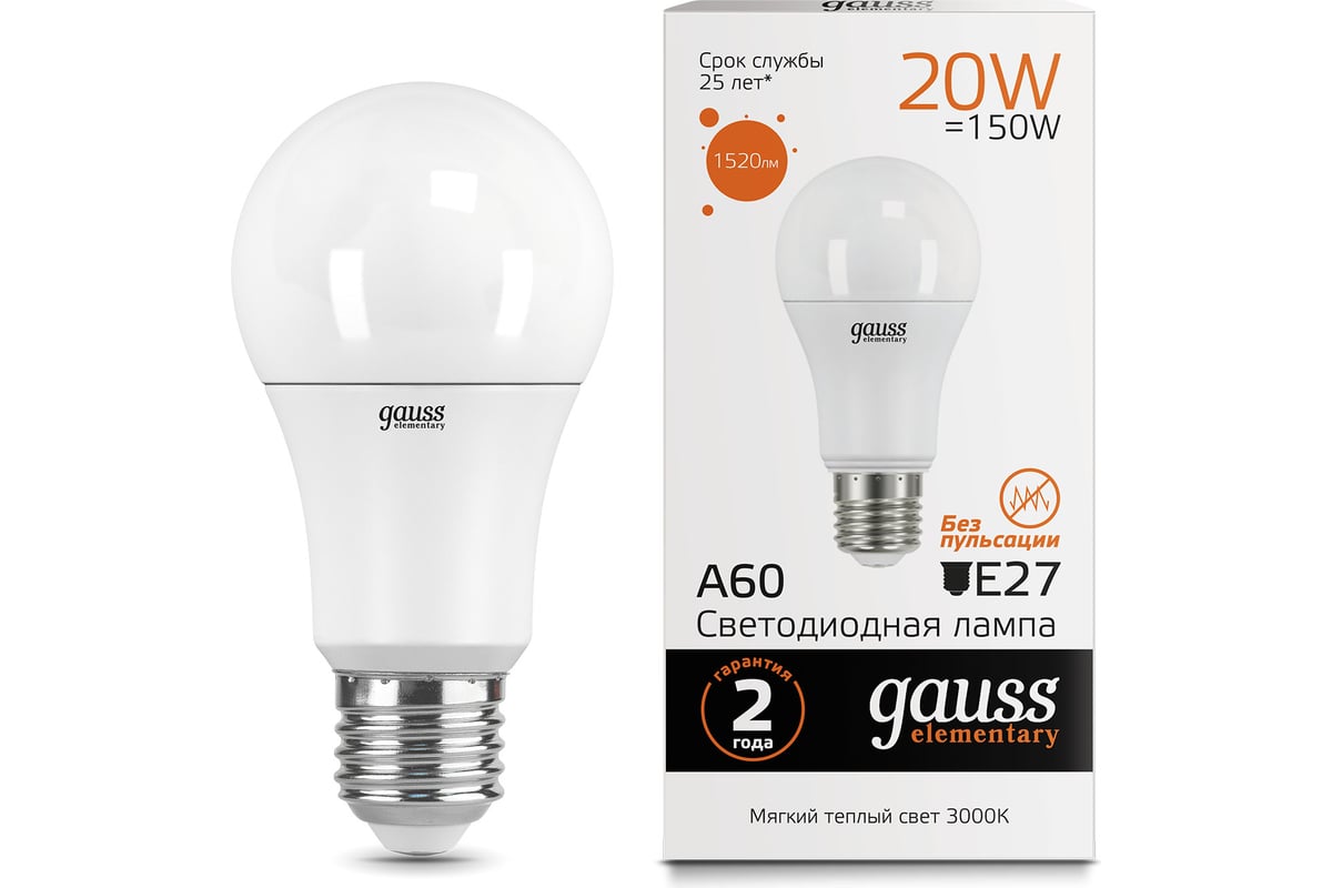 Лампа LED A60 20W E27 3000K GAUSS Elementary 23219 является энергосберегающей заменой обычным лампам накаливания. Равномерное распределение света создает зрительный комфорт в любом помещении.
