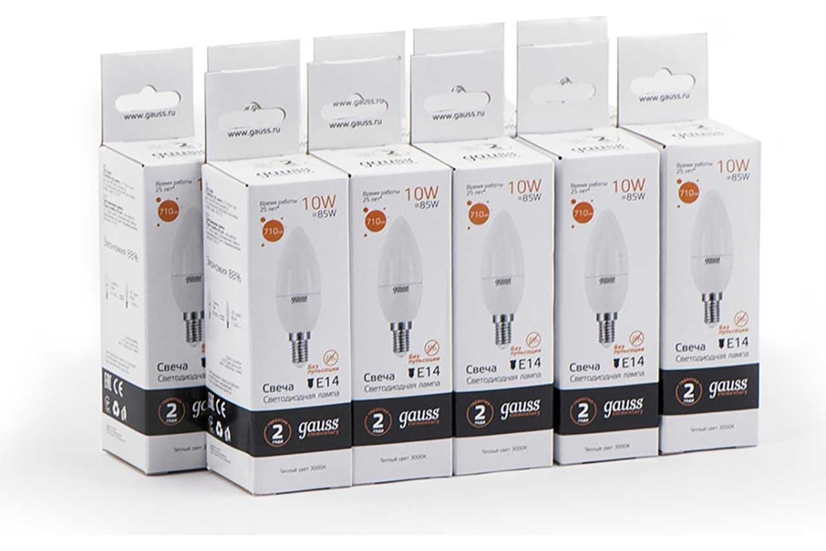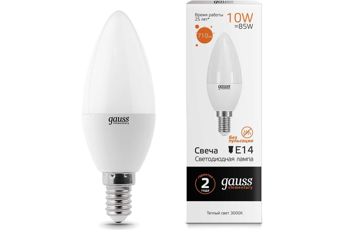 Лампа Gauss LED Elementary Свеча 10W E14 710lm 3000K 33110 подойдет как для домашнего, так и для коммерческого использования. Такой тип освещения прекрасно смотрится в светильниках без плафонов или устанавливается в люстры и бра. Равномерный спектр света создает зрительный комфорт в любом помещении.