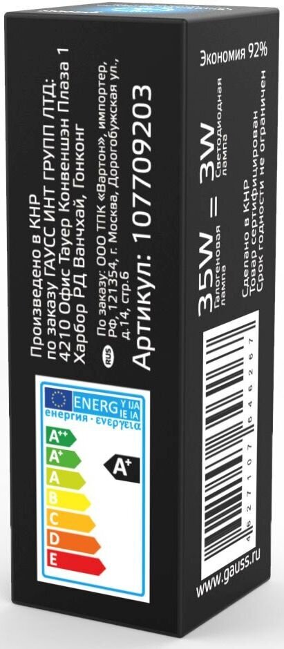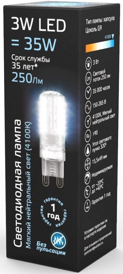 Технические характеристики Gauss LED G9, AC85-265V, 3W, 4100K 107709203