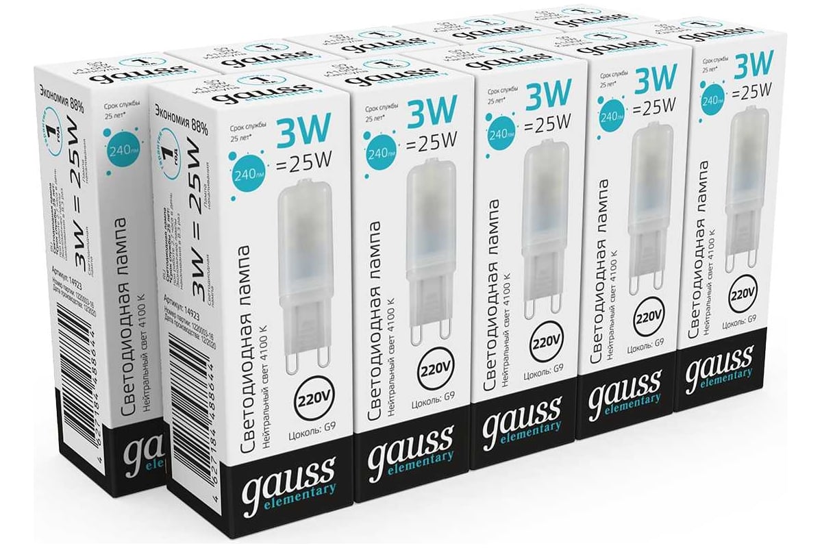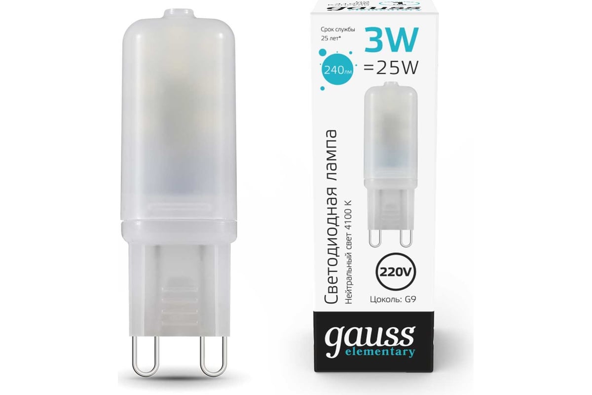 Технические характеристики Gauss Elementary G9, AC220-240V, 3W, 240lm, 4100K, пластик, LED 14923
