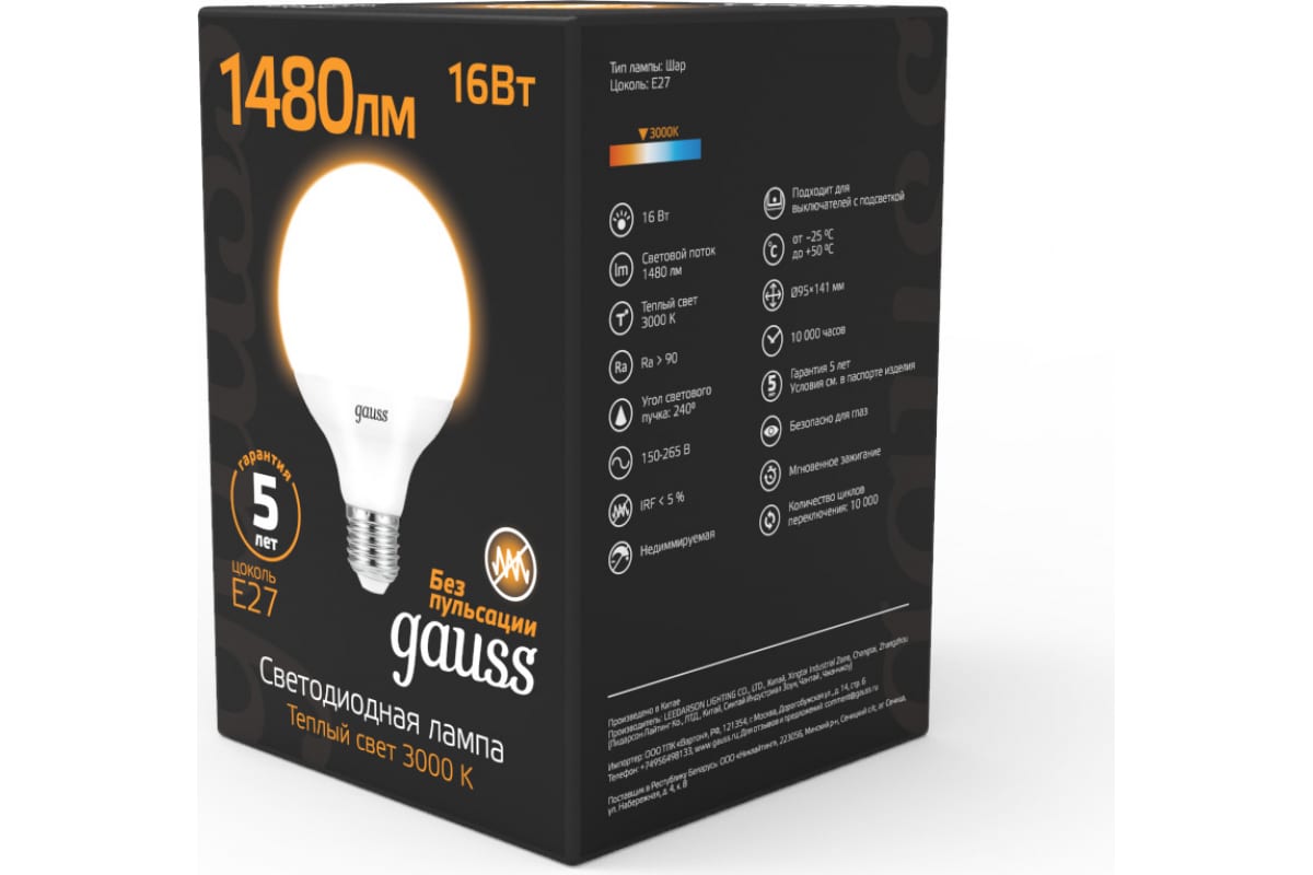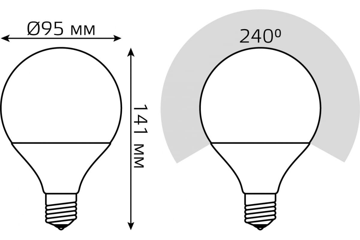 Технические характеристики Gauss LED G95 E27 16W 1360lm 3000K 1 32 105102116