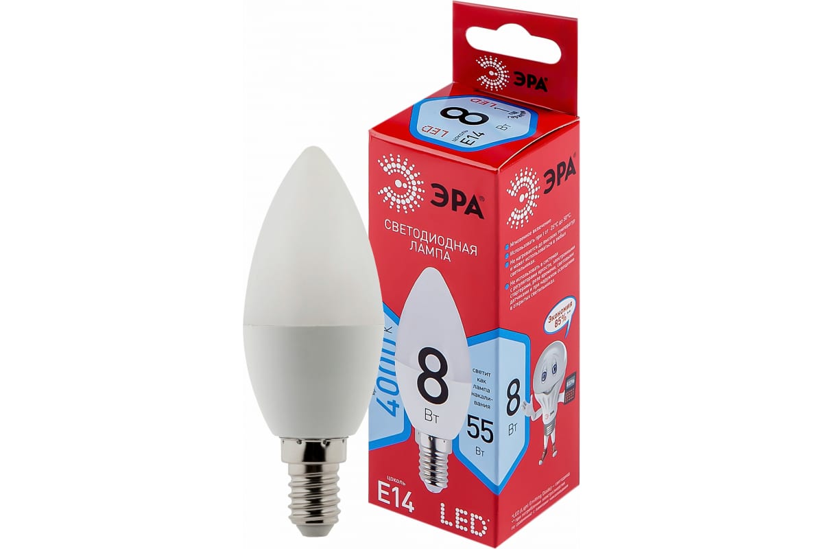 Светодиодная лампочка ЭРА RED LINE LED B35-8W-840-E14 R E14 / Е14 свеча, 8Вт, нейтральный белый свет Б0050200 создаёт яркое ровное освещение и экономит до 90% электроэнергии по сравнению с лампой накаливания с аналогичным световым потоком. Светит теплым светом с жёлтым оттенком - такая цветовая температура эффективна для отдыха и уютной атмосферы в доме. Используется в потолочных, настенных, настольных светильниках, в люстрах и бра. Мгновенно включается и не нагревается.