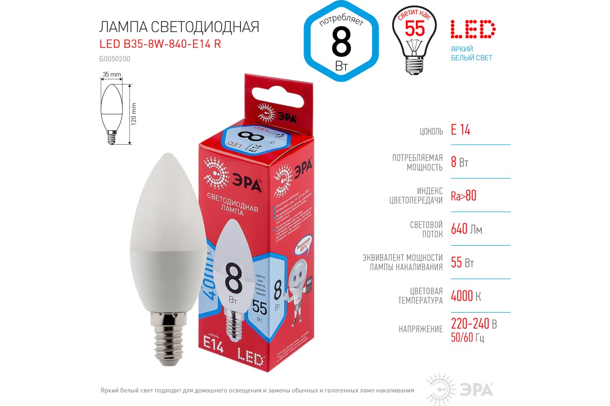 Технические характеристики ЭРА LED B35-8W-840-E14 R E14 / Е14 свеча, 8Вт, нейтральный белый свет Б0050200