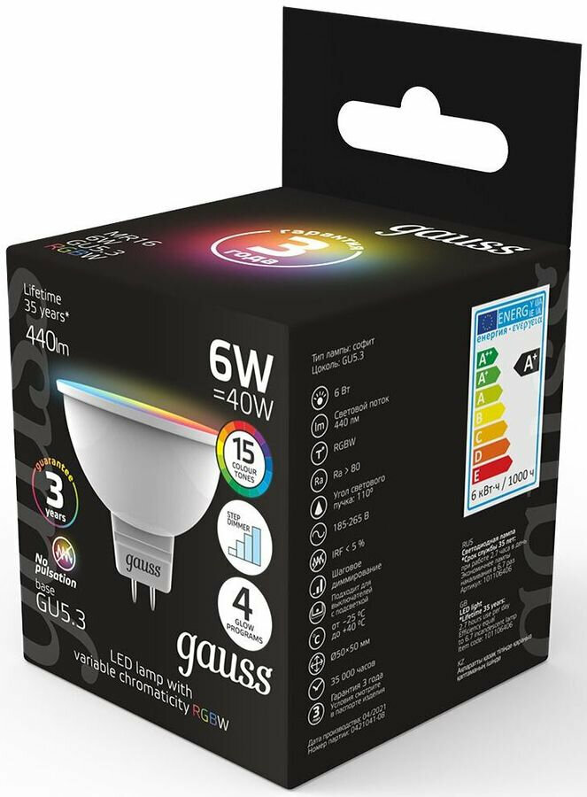 Технические характеристики Gauss Smart MR16, 6W, GU5.3, RGBW+dim 101105406