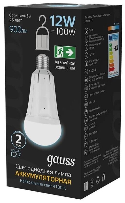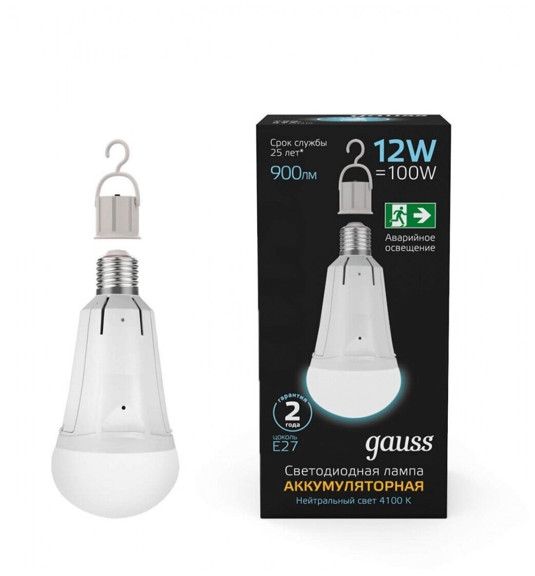 1.Аварийная лампа Gauss A80 12W 900lm 4100K Е27 с Li-Ion аккумулятором LED 1/5/50 102002212 продолжает работать при отключении электропитания.