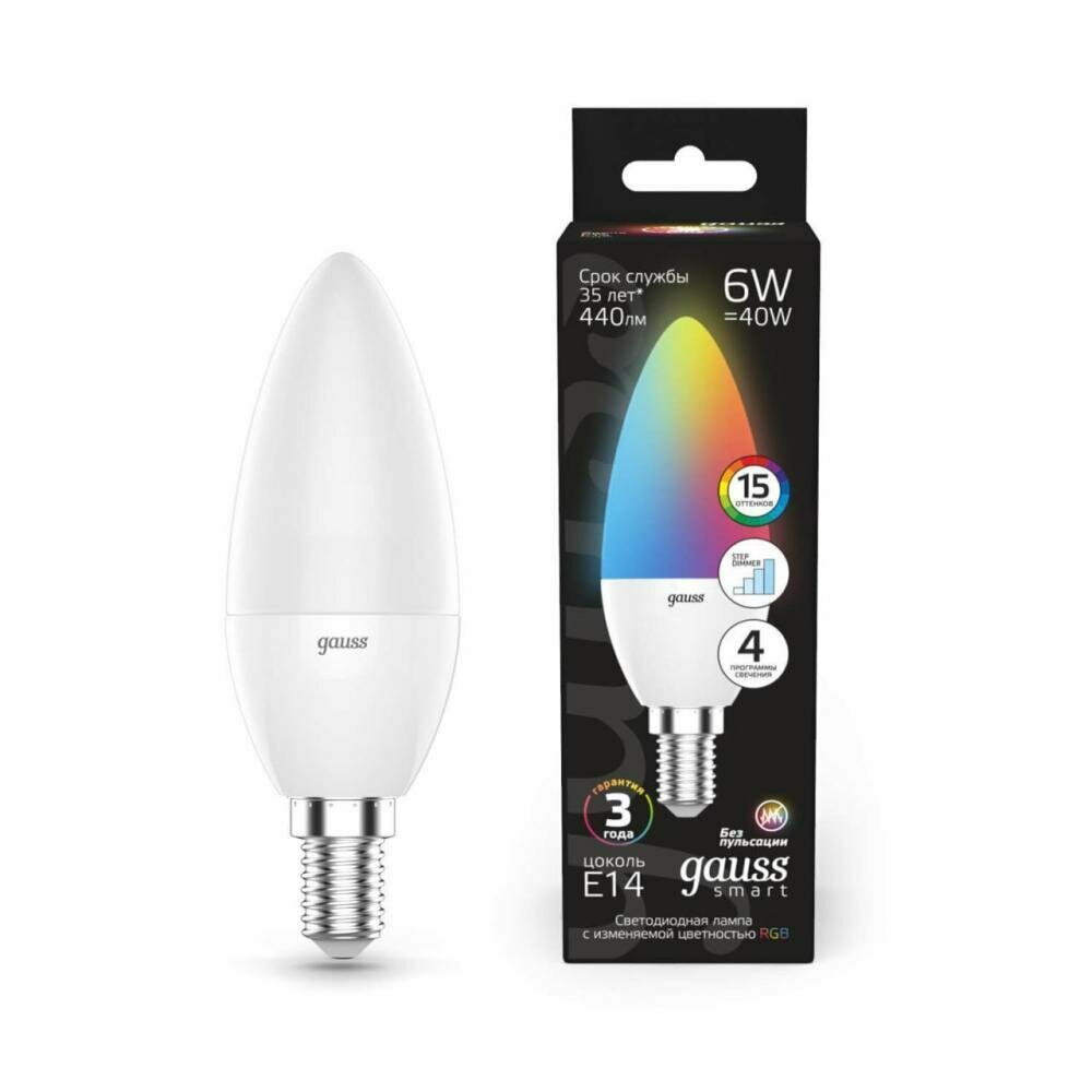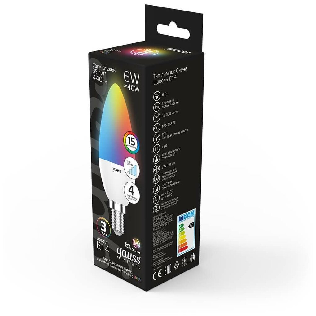 Технические характеристики Gauss Smart LED, свеча, С37, 6W, E14, RGBW+dim 103101406