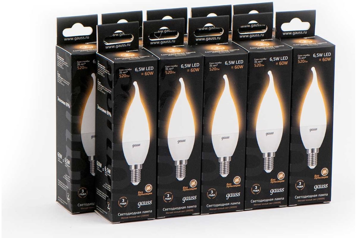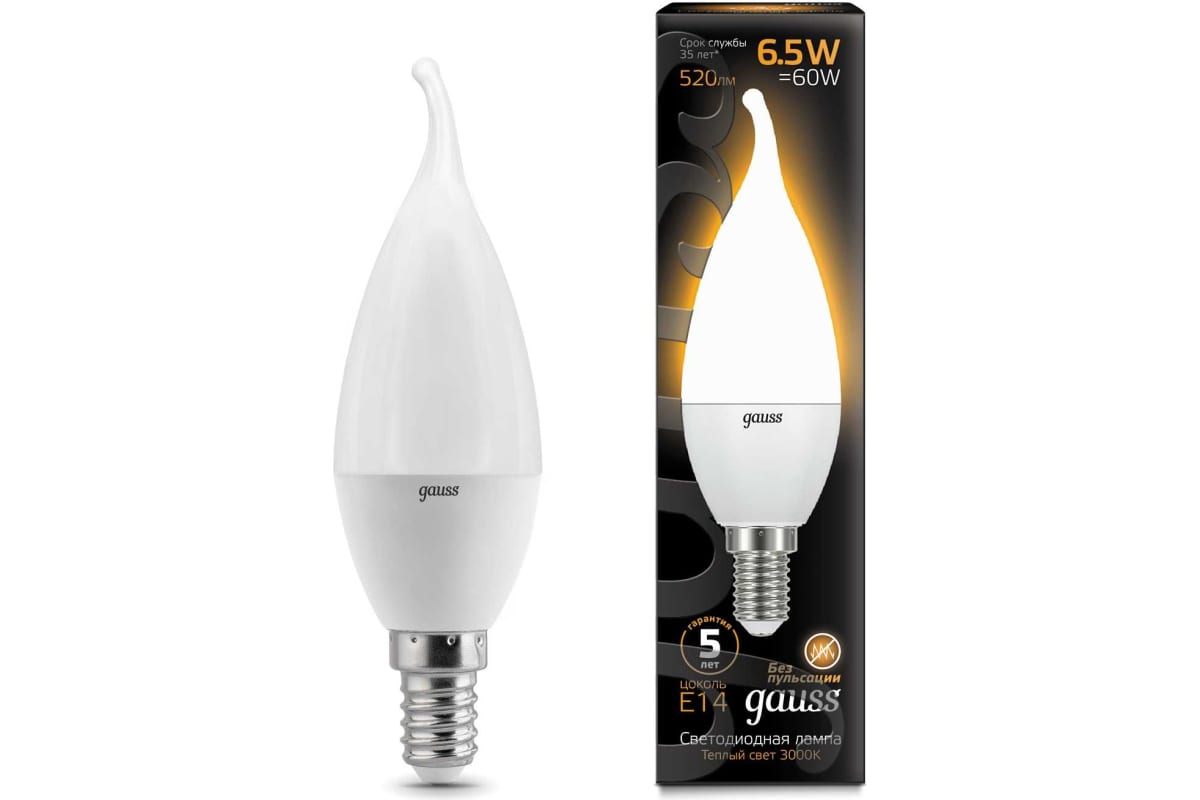 Лампа Gauss LED Свеча на ветру E14 6.5W 520lm 3000K 104101107 подойдет как для домашнего, так и для коммерческого использования. Такой тип освещения прекрасно смотрится в светильниках без плафонов или устанавливается в люстры и бра. Равномерный спектр света создает зрительный комфорт в любом помещении.