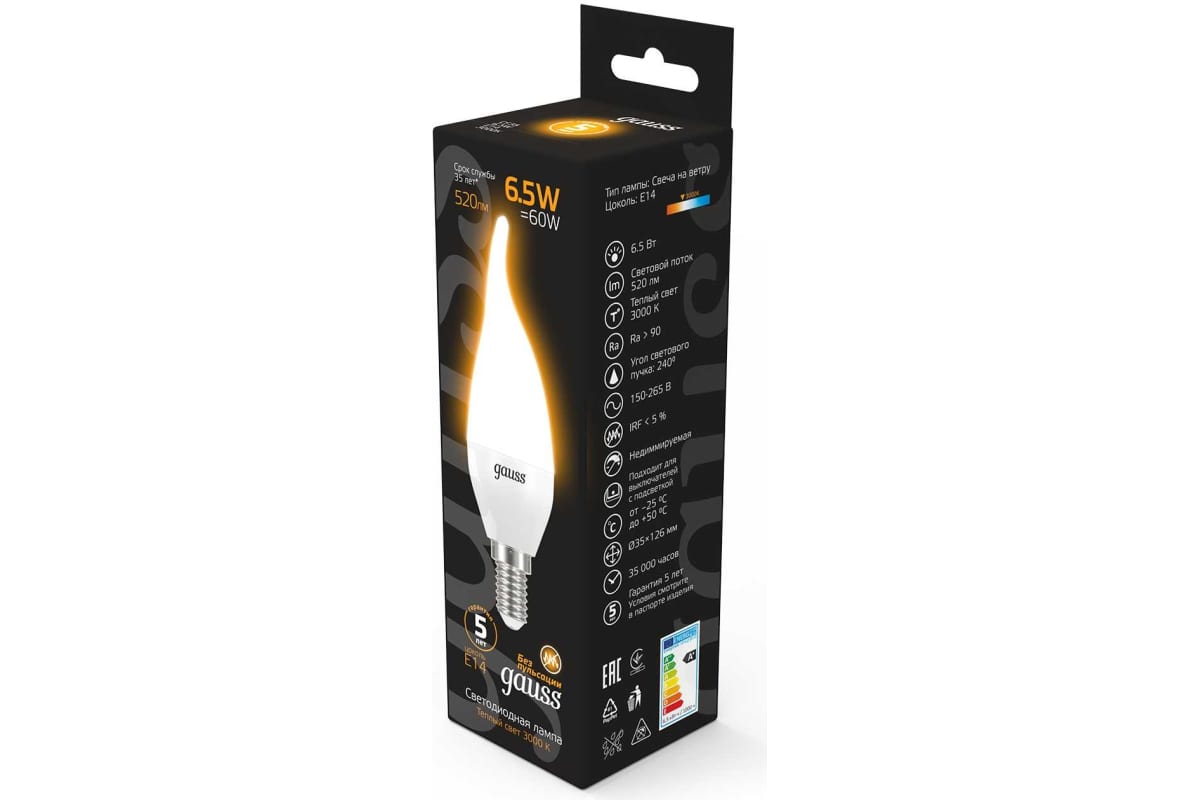 Технические характеристики Gauss LED Свеча на ветру E14 6.5W 520lm 3000K 104101107