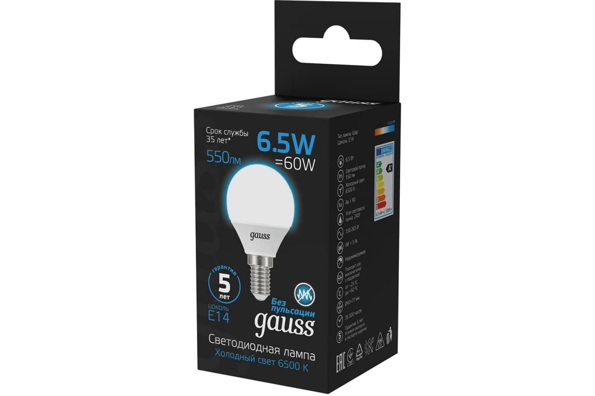 Технические характеристики Gauss Шар 6.5W 550lm 6500K E14 LED 105101307